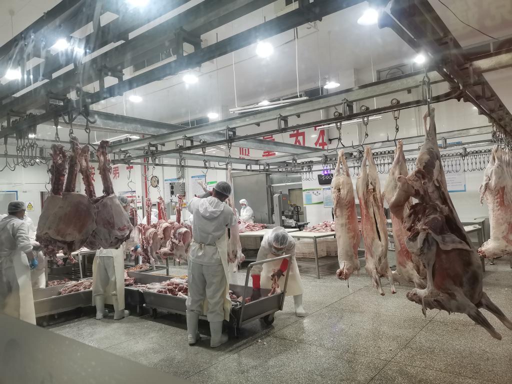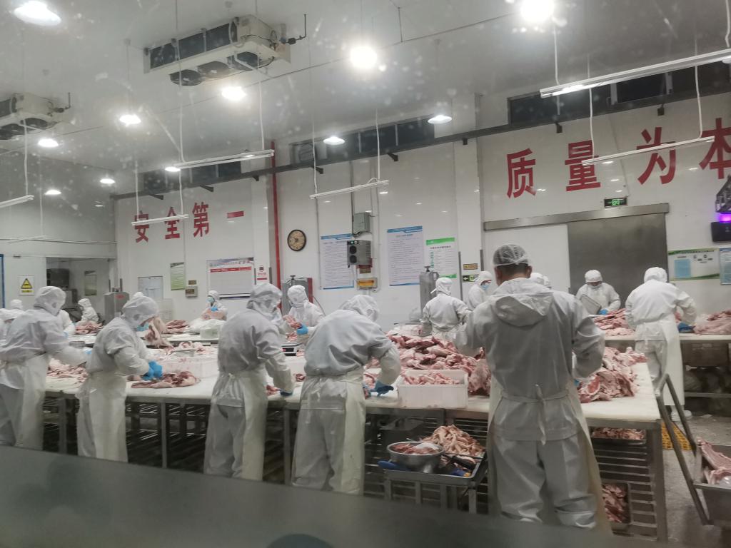 同学们首先参观了宁鑫屠宰基地,近距离参观了滩羊的流水线生产加工过程,实地见识了生产工人们“庖丁解羊”一般的专业技术和高效率的管理成果。在介绍中,我们了解到宁鑫羊肉屠宰加工的专业性,其采用了国内先进的流水生产线,经过6个关键控制点和RFID可追溯体系来实现对高品质的管控。通过冷链排酸、精细加工、精准切割,在保证美味的同时做到安全健康生产。
