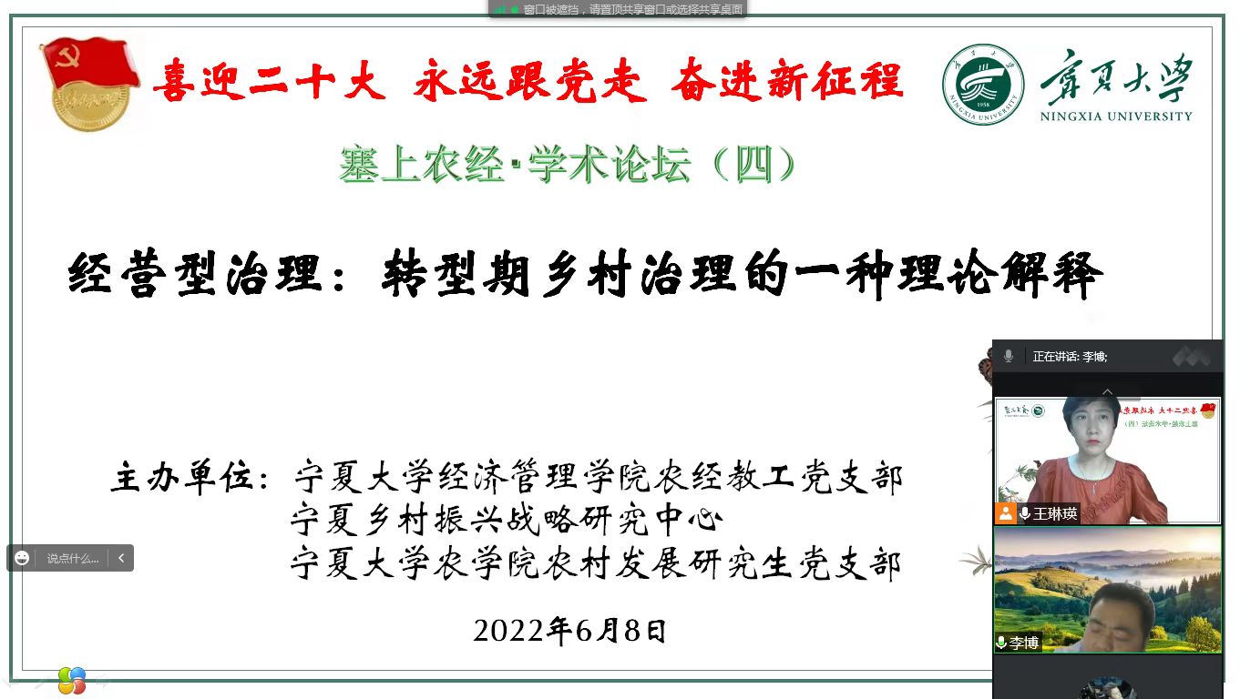 6月8日晚,亚新体育 农经教工党支部和宁夏乡村振兴战略研究中心联合主办的“塞上农经•学术论坛”(第4期)如期举行。讲座特别邀请西安建筑科技大学公共管理学院李博副教授主讲“经营性治理:转型期乡村治理的一种理论解释”主题报告。亚新体育 农学院党委副书记葛志军,亚新体育 农经系主任东梅参加报告会。会议由农经系王琳瑛老师主持。
