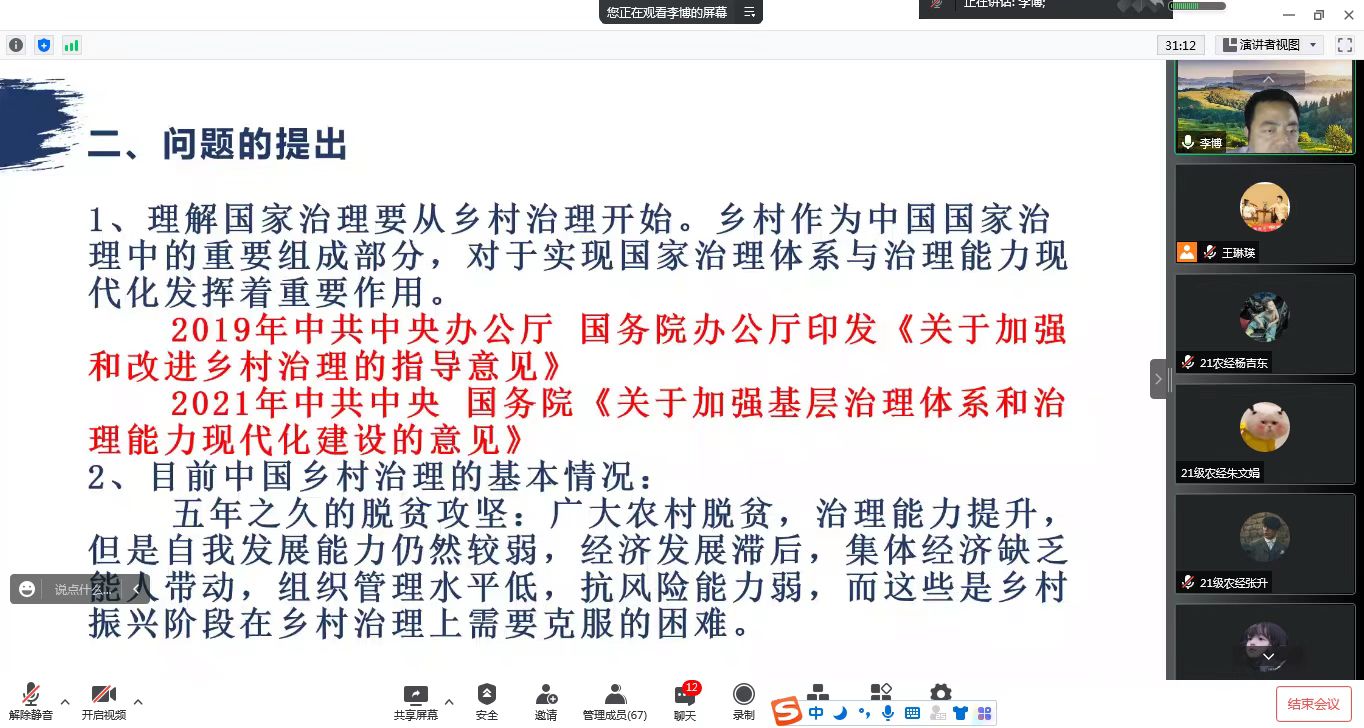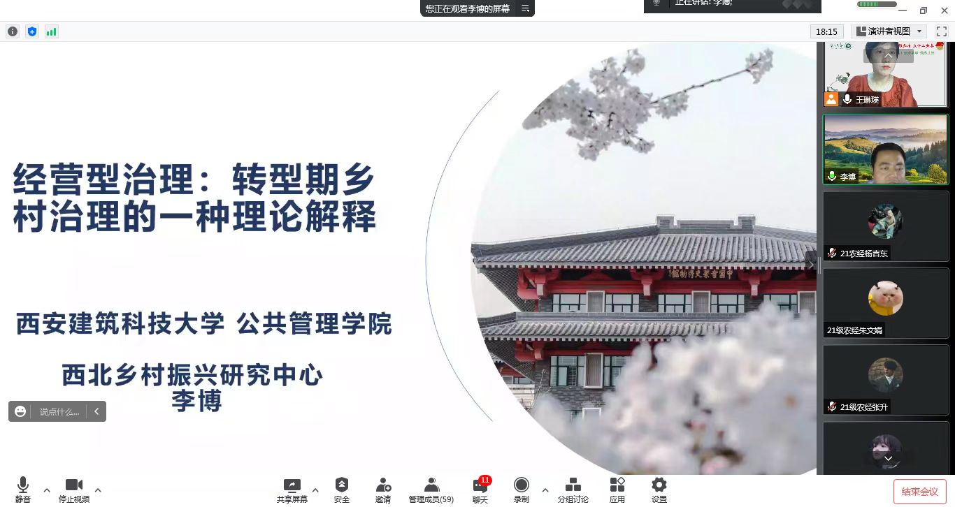 在云报告厅的答疑互动环节,新疆农科院的苏武峥,亚新体育 农经本科生朱之毅,农经研究生李欣欣、农村发展研究生韩成梅和金向琴先后与李老师进行了学术探讨与交流。强化三治融合,是实现治理有效、乡村善治的必由之路。