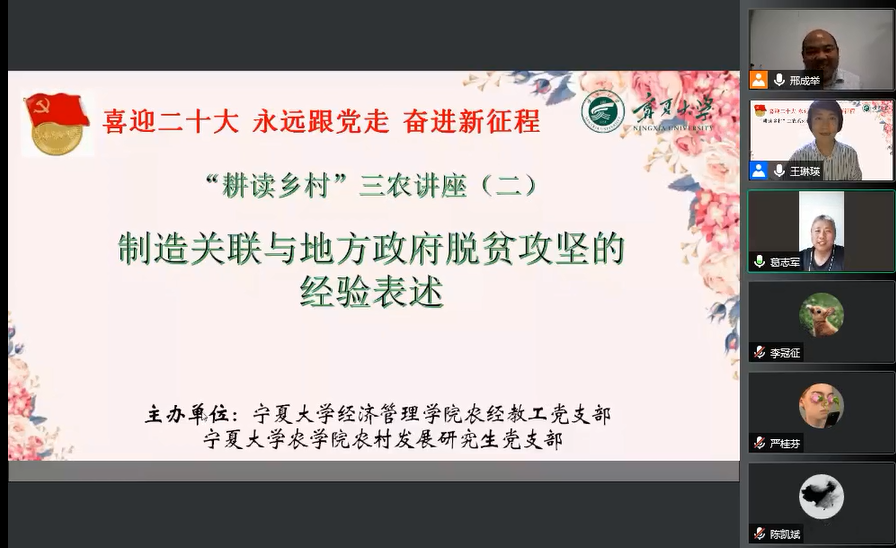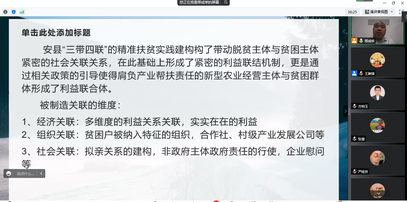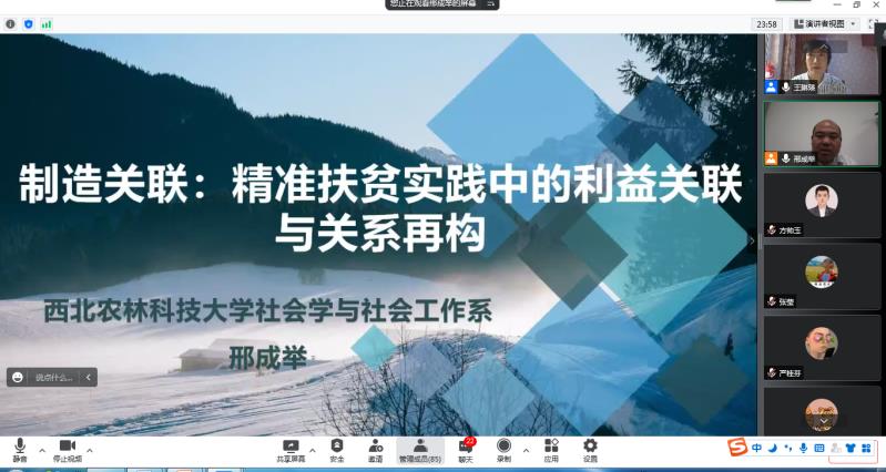 5月25日,亚新体育 农林经济管理教职工党支部线上举办了“耕读乡村”三农系列讲座第二讲。特邀西北农林科技大学人文社会发展学院副教授,社会学与社会工作系党支部书记,系主任邢成举担任主讲人,报告题目是“制造关联:精准扶贫实践中的利益关联与关系再构”。农学院党委副书记葛志军,亚新体育 农林经济管理系主任东梅,农经教工党员及研究生、本科生参加了线上学术活动。讲座由农经教工党支部组织委员王琳瑛主持。