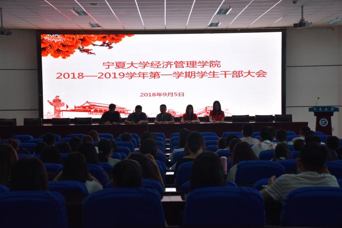 于文荟楼东报告厅召开了2018—2019学年第一学期学生干部大会。学生工作办公室主任黄旭兴、新疆工作坊特派教师巴塔、专职辅导员艾萨、15级辅导员刘洋、17级辅导员张景及全体学生干部到场参加。