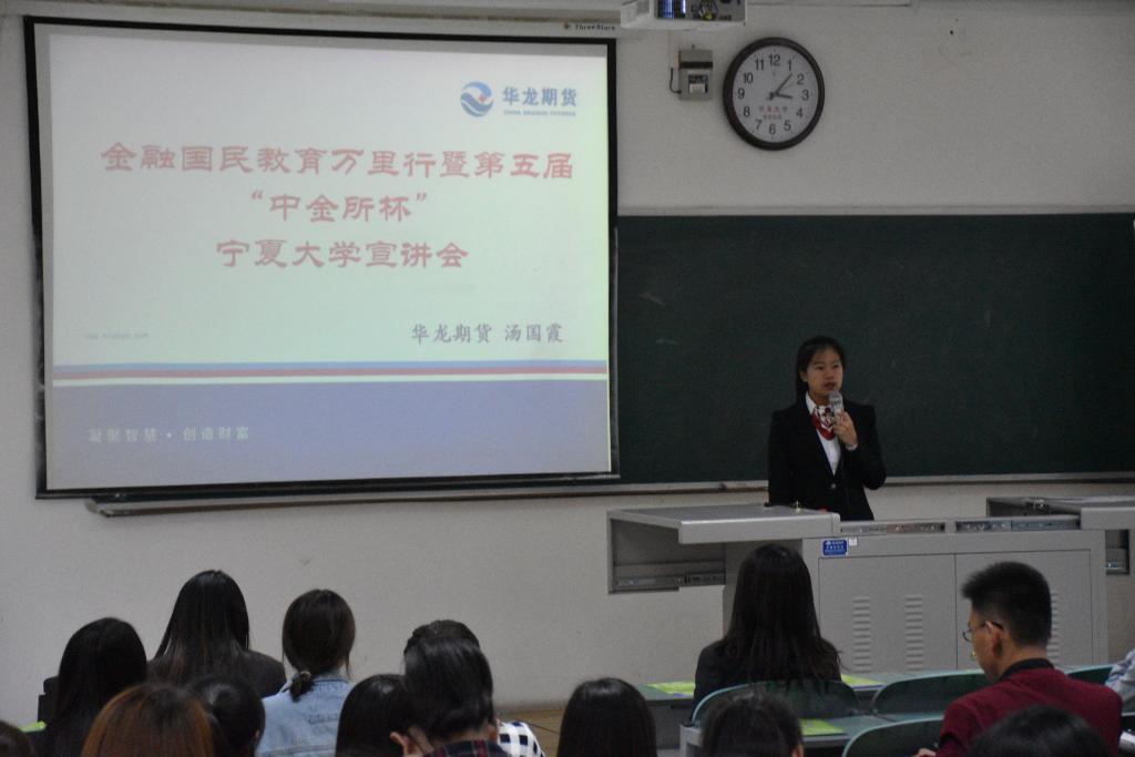 15点左右,由华龙期贷公司营销部成员汤国霞和戴昊共同主讲的宣讲会正式开始。首先,汤国霞对其公司做了简明扼要的介绍。随后,她进行了证券期贷市场概述、行业年度资格考试计划传达、“中金所杯”大赛内容介绍以及大赛样题解读四大板块的详细介绍。其中,在她阐述“中金所杯”比赛的具体内容时,从主办方简介、大赛的目的、参赛对象及参考题库、大赛流程和奖励设置五大方面进行了详细介绍。在大赛样题解读环节中,汤国霞与现场同学积极互动,抛出许多问题,既带动了现场气氛,又引发大家主动思考。