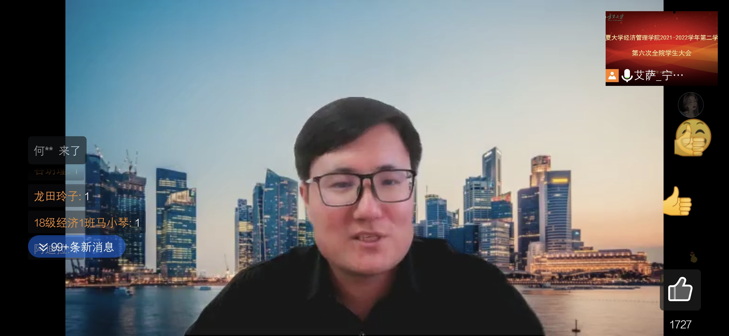 2021—2022年度第二学期第六次年级大会。学院党委副书记马建宏、常江,党建秘书姚硕,学生工作办公室辅导员艾萨•阿尤普、孙文元、禹文杰,研究生辅导员李立朋,学院全体本科生和研究生参加了会议。会议由艾萨主持。