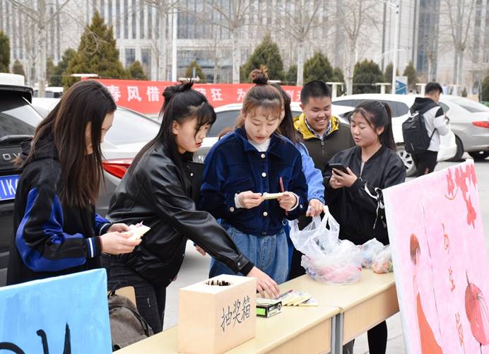 为更好地彰显恣意靓丽的青春,女生部用明亮的天蓝色和鲜丽的少女粉为主打色涂饰用以表白祝福的心意墙、愿望墙。伴随着清新悠扬的音乐,同学们结伴来到展板前写下自己的心语心愿,并亲手把自己的愿望卡片贴在了展板上。“心”“愿”墙上既有情侣一起写下长伴余生的美好期许,也有小姐姐表达对好友的真挚祝福,还有同学许下英语四六级必过的“实用型”愿望……除此外,同学们还积极地参与了抽奖活动,不仅收到了女生部送出的暖心祝福,还获得了许多精美的小礼物,现场热闹非凡。