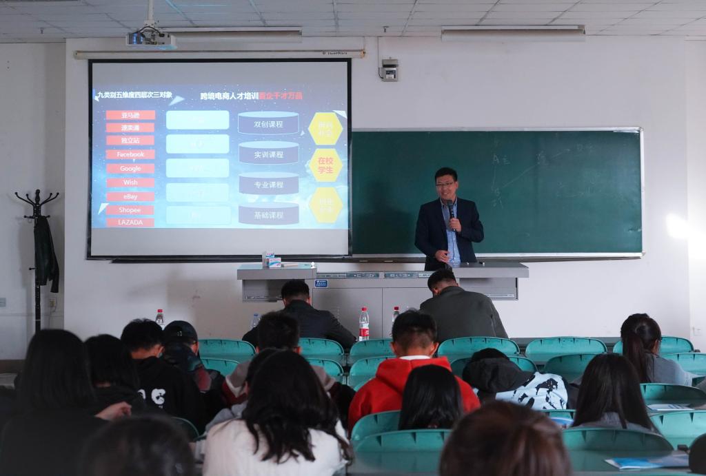 伏芳伟通过一组照片带领同学们走进跨境电商产业园,参观了宁夏进口产品及特色商品展览馆。在同学们兴趣盎然之时,伏芳伟介绍了宁夏跨境电商人才培养平台,总结了培训平台分领域,分层次,分对象,分模块的培训特点。就平台与学校的合作,伏芳伟表明可以通过共建专业学科的方式促成校企一站式服务流程。对于未来的合作与培训,伏芳伟从专业人才,创业团队,品牌,营业额等方面提出预期目标。讲座在同学们热烈的掌声中圆满结束。
