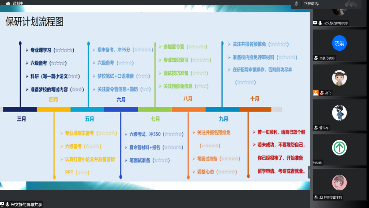本次保研经验交流分享会,增加了同学们对保研信息的了解,进一步拓展了保研知识经验与技巧方法,让同学们对保研的过程有了更加全面的认识。路漫漫其修远兮,吾将上下而求索,学长学姐们的倾囊相授,拨开了许多同学眼前的迷雾,让同学们收获良多。希望同学们能从学长学姐的经验中获得启发,追逐自己梦想的院校和专业,在保研之路上行稳致远。