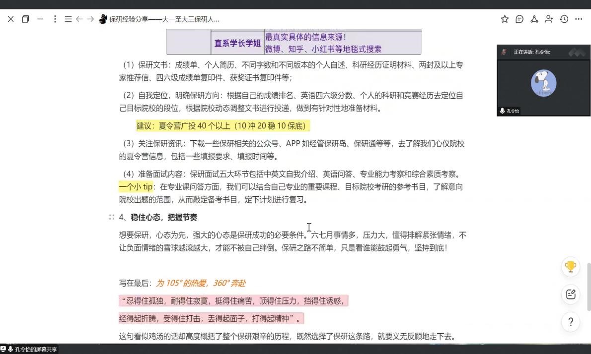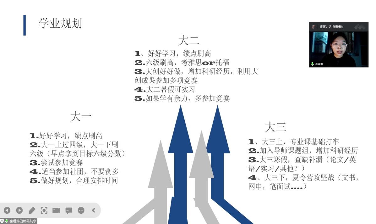 崔琳琳结合个人情况详细介绍了保研的前期准备,并就面试应答、投递院校给出相关策略,帮助同学解答如何回答面试问题等相关问题。她希望同学们对自己未来提前做好规划并尽快行动。孔令怡详细介绍了大一到大三保研的学习生活:大一应提前做规划并尽快熟悉环境,培养自己独立思考意识,享受丰富的大学生活;大二在掌握学习成绩的基础上多参与含金量高的竞赛并尝试撰写论文;大三稳住专业排名、坚持学习英语并开始准备保研相关事宜。马和霞分享了个人支教经历和大学生活,并结合自身获奖、入党经历鼓励同学们有选择地参与兴趣活动来锻炼、提升自己。