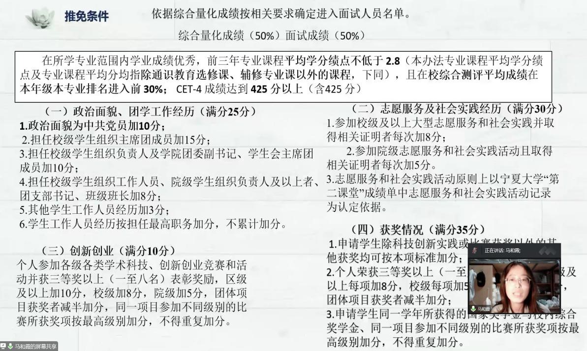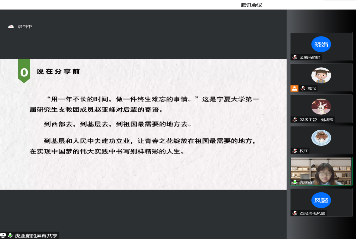 10月21日、22日晚,“塞上青春讲坛”系列活动之保研经验交流分享会于线上顺利召开。本次分享会由2019级本科生宋文静、梁振刚、权旺、虎亚茹、崔琳琳、孔令怡及2022级专业会计硕士马和霞分享,亚新体育