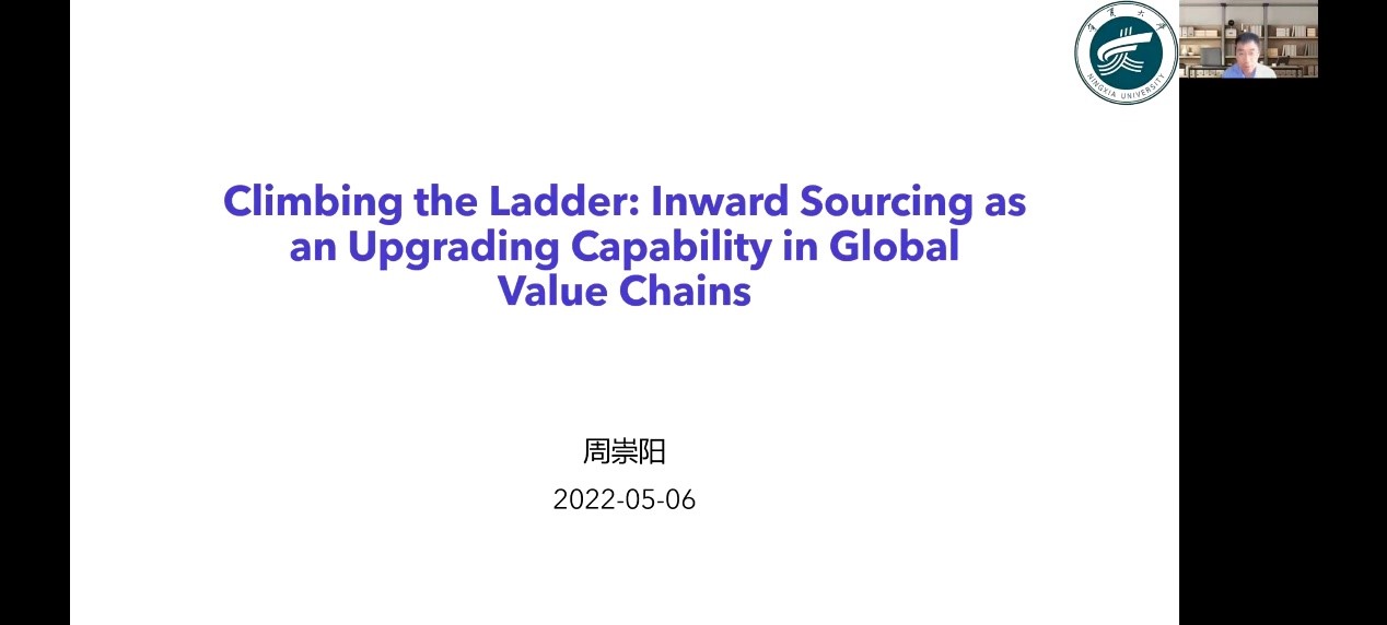 本次讲座中,周崇阳博士分享了他发表在国际顶级学术期刊《Research Policy》的英文文章,让我们了解了新兴经济体、全球价值链、内向采购等方面的知识,拓宽了我校师生的知识领域。本次会议不仅促进了国内外师生的学术交流,为我们思考企业如何实现转型提供了全新视角,也进一步营造了浓厚的学术氛围,巩固了宁大经管学术交流品牌活动。