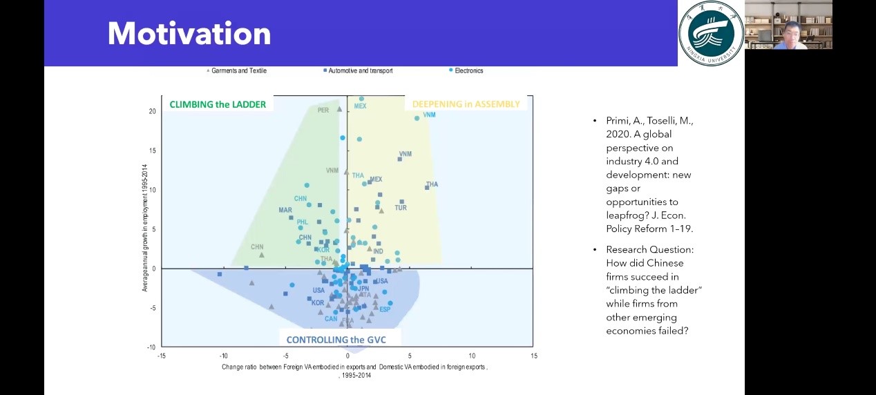 本次讲座中,周崇阳博士围绕“新兴经济体企业如何在全球价值链中进行技术升级,避免陷入低附加值经济活动?”这一问题,从全球价值链的概念及影响、发展中国家的新兴经济体在全球链中的发展阶段、新兴经济体如何在全球价值链中进行技术升级等方面进行了讲解。首先,周崇阳博士对全球价值链的概念以及全球价值链过程中出现的“俘获效应”、“微笑曲线”进行了解释。其次,周崇阳博士指出,发展中国家的企业在全球价值链中要经历“in-out-in”三个阶段,他强调了“out”阶段的重要性以及存在的问题。而后,通过对研究背景、理论基础的详细介绍,他分享了论文的研究假设、研究变量、研究方法与研究结论。最后,周崇阳博士进行了总结:通过对内向采购能力的分析与研究,我们发现内向采购能力对于新兴经济体公司的技术升级、参与全球价值链“out”阶段至关重要;本研究丰富了“in-out-in”GVC政策、“内向采购”相关研究,也为研究中国企业摆脱低附加值经济活动的束缚以及其他新兴经济体进入全球价值链“out”阶段提供了指导意义。