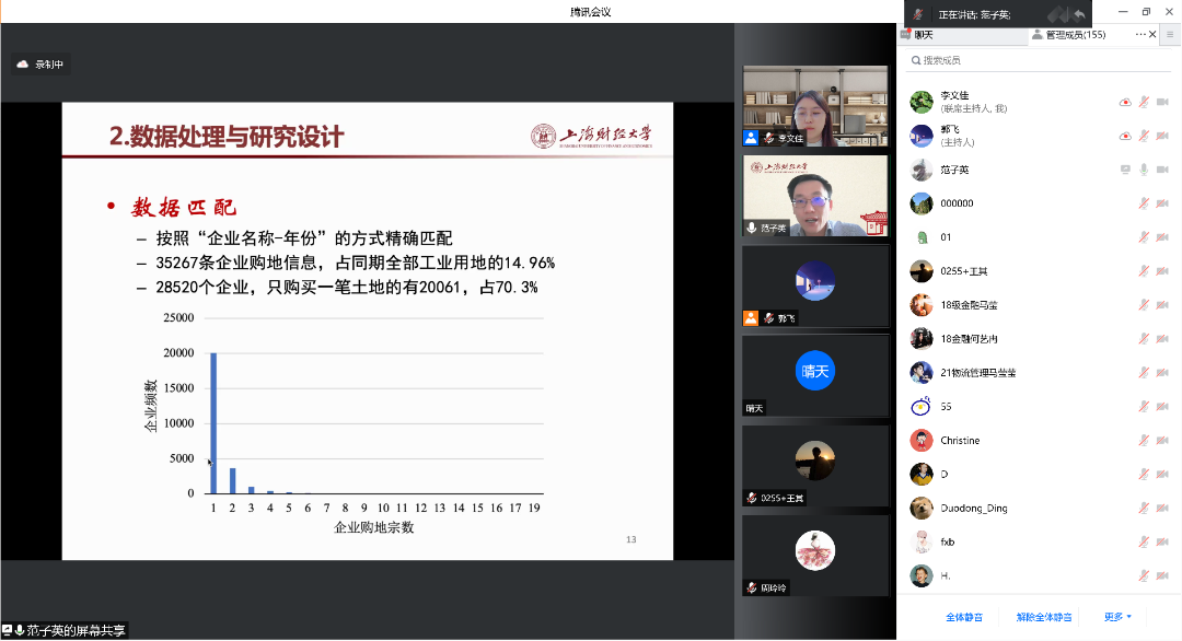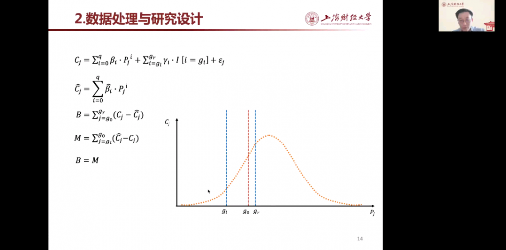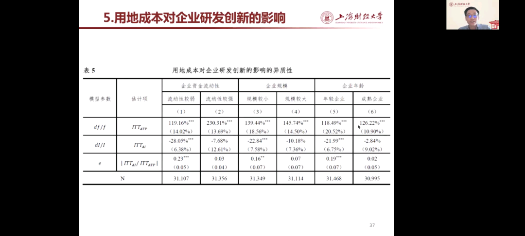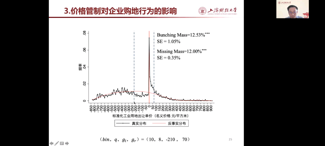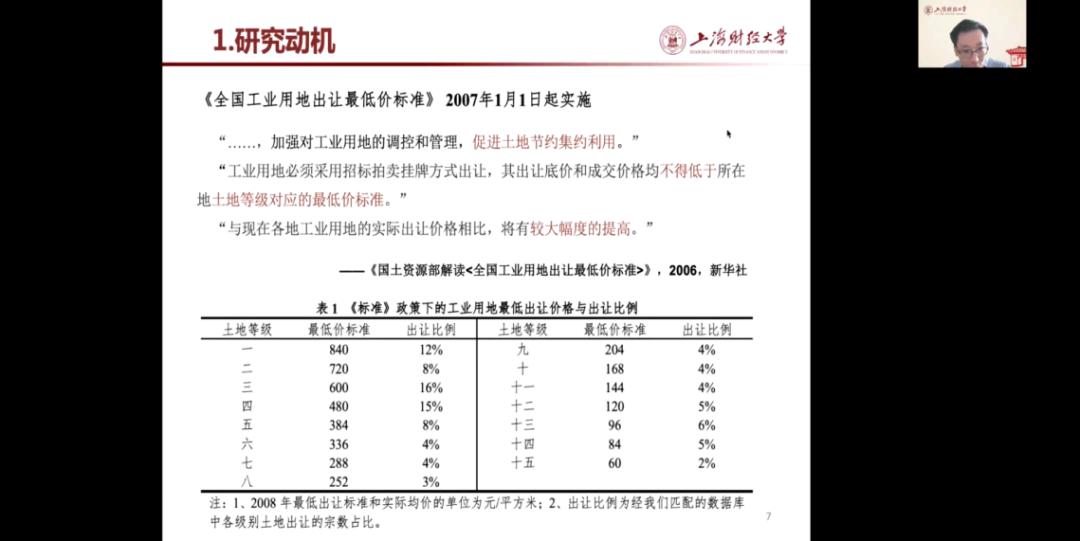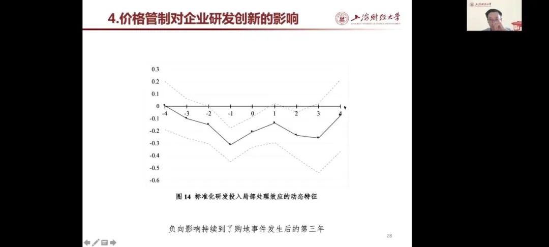 在论文分享中,范子英教授主要从研究动机、在数据处理与研究设计、价格管制对企业购地行为的影响、用地成本因素对企业研发创新的影响、结论与政策含义等方面进行介绍。在研究动机方面,主要包括政府土地政策、近几年来企业用地发展趋势、企业用地成本与研发创新之间的关系等。其次,在数据处理与研究设计上,范子英教授借助图像和公式进行讲解,并且多角度分析了价格管制对企业购地行为的影响。之后,范子英教授还分享了本次研究数据的匹配过程以及数据处理逻辑,进一步解释了价格管制对企业购地行为的影响、用地成本因素对企业研发创新的影响。最后,范子英教授进行了总结:本次研究发现管制政策产生了明显的群聚现象;管制政策显著改变了企业的生产经营行为,导致企业出现研发投入的挤出效应;挤出效应与企业的融资约束紧密相关,这些研究发现对政策具有启示。本次研究也表明企业研发活动具有极强的风险属性,成本波动对研发投入的负向影响明显;融资约束依然是企业研发投入的重要障碍;由于政策未得到完全贯彻,违规出让土地依然存在。