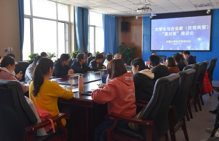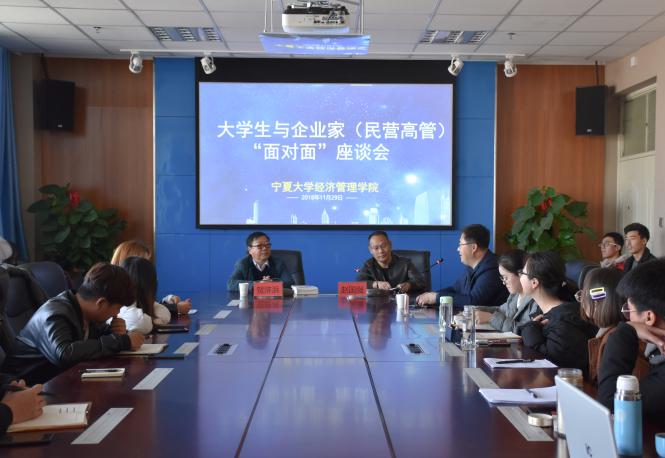 大学生与企业家(民营高管)“面对面”座谈会于贺兰山校区文荟楼904会议室顺利开展。宁夏宝丰集团副总裁贺浒浜及深圳民企纵横企业管理咨询公司董事长、总经理赵国强到场参加,16级工商管理与市场营销专业同学到场学习。此次座淡会以“人力资源”为主题,由学院党委副书记程胜利主持。