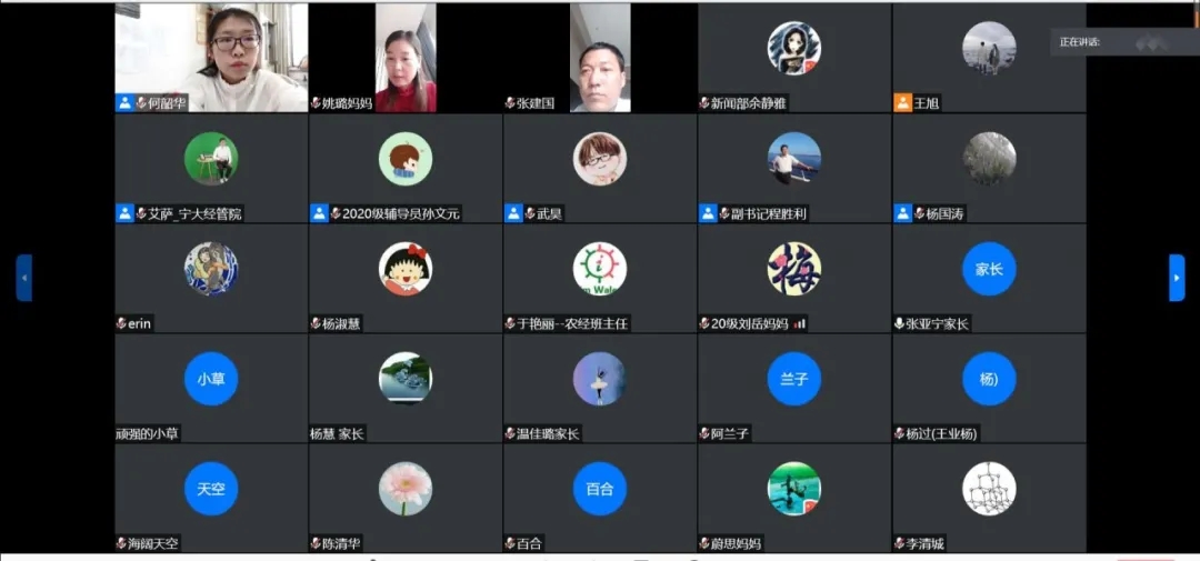 院长杨国涛、党委副书记程胜利、学生工作办公室负责人何韶华、学生工作办公室辅导员艾萨、孙文元、9位新生班主任以及2020级新生家长共同参与了此次见面会,会议由何韶华主持。