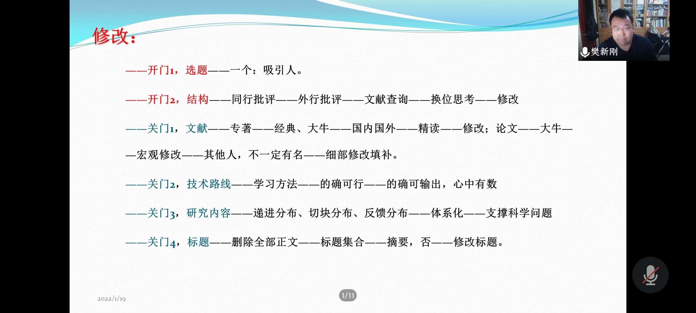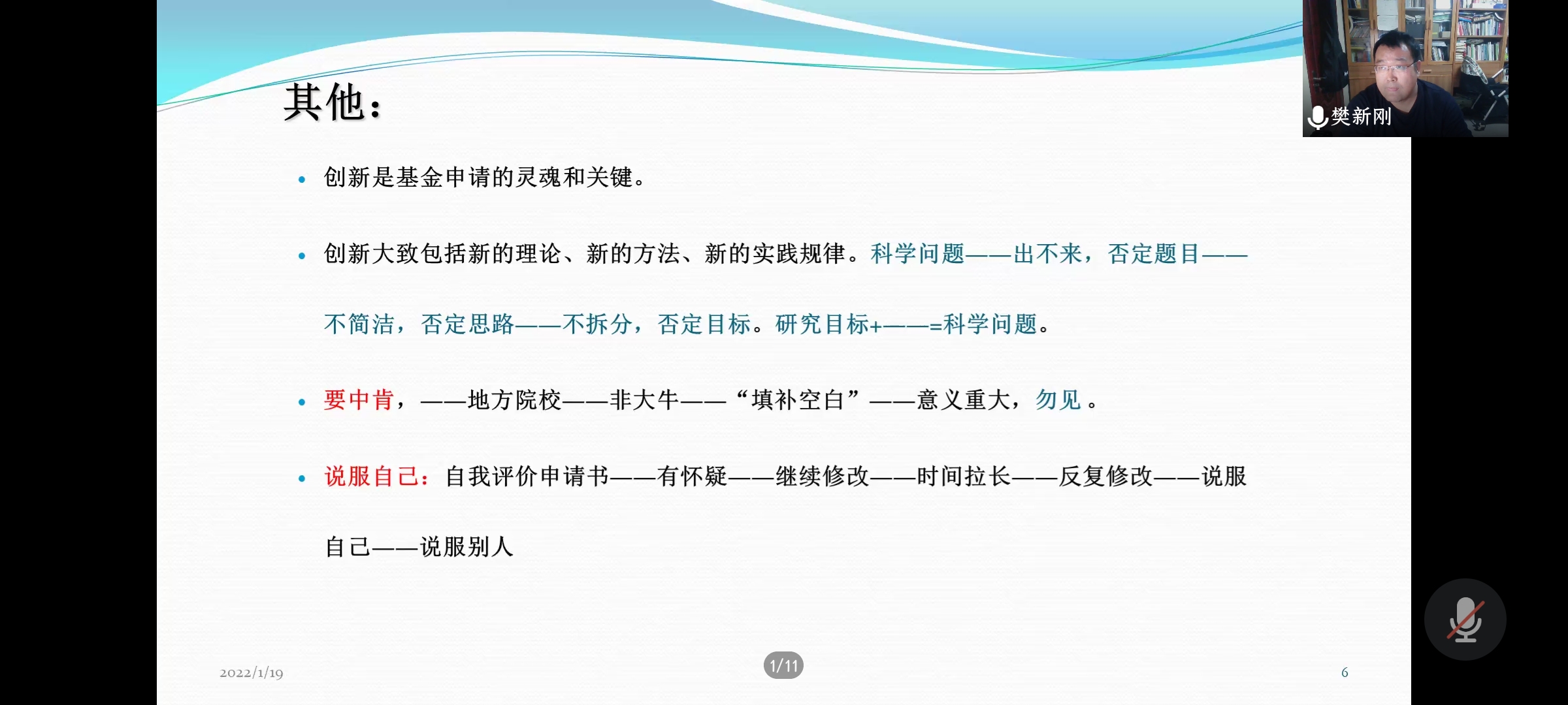 樊新刚老师从国家自然科学基金申请书的选题、写作、修改三个方面分享个人经验。在选题方面,樊新刚指出要认清学科位置,把握题目来源,题目要凝练而新颖。在写作方面要做到语言通顺,逻辑清晰,聚焦国内外进展,适当添加图表以丰富文章内容,并充分展现出个人的积累成果或团队的组合优势。在文章的修改中要做到标题具有概括性,文献具有权威性并与研究内容相贴合,技术路线具有充分可行性,研究内容体系化,能够支撑科学问题。另外,樊新刚老师谈及在申请书的撰写中要把握好“创新”这个关键词,研究内容要中肯,文章要具有说服力。