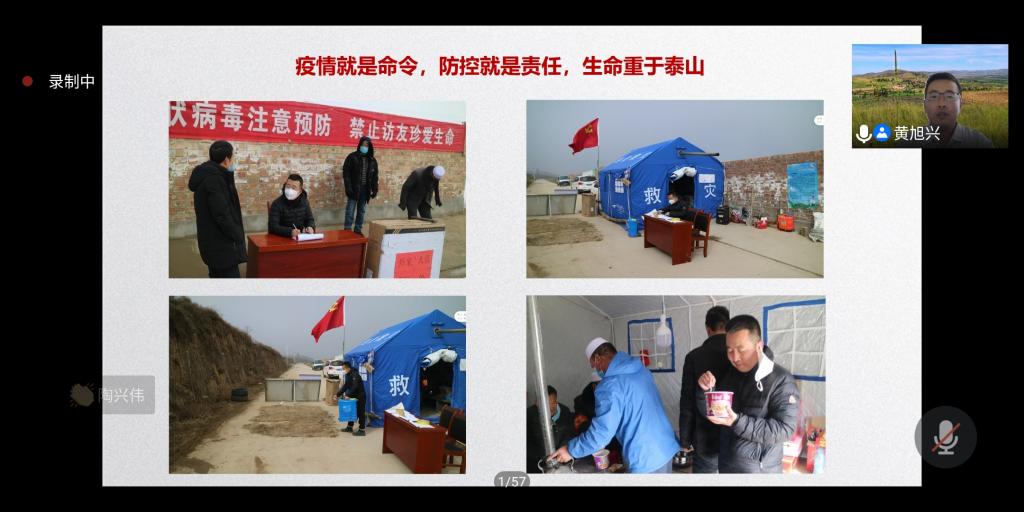 团课伊始,黄旭兴首先对自己所去的冯洼村的地理情况、基本数据、产业发展情况、贫困人口、农村收入情况做出了详细讲解。而后他从三个角度讲述了他的脱贫故事:坚决打赢脱贫攻坚是党旗所指、团旗所向。他们不忘初心,牢记使命,也曾遇见各种问题,熬过无数个夜晚,走过了弯弯绕绕的山路,在健康扶贫,资产扶贫中,一步一个脚印,改变着这个山村;而后他指出,在脱贫攻坚关键期、防控疫情的特殊时期,疫情就是命令,防控就是责任,生命重于泰山。“听党话,在疫情防控斗争中挺身而出,英勇奋斗、扎实工作、无论生死!出发!”他这样对同事们说道,面对疫情他们仍没有退缩,不漏一户,不落一人,为村民科普医疗知识,保障村民人身安全;此外他深知“扶贫先扶志,扶贫必扶智,这是一个人民教师的职责。”他不但在空余时间给孩子们上课,而且还捐赠物资给孩子们,让孩子们受益于教育扶贫,也身体力行地教育孩子们投身于美丽中国的建设。叙述最后,他指出同学们作为当代青年要坚定理想信念、站稳人民立场、练就过硬本领、投身强国伟业、始终保持艰苦奋斗的前进姿态,同亿万人民一道,在实现中华民族伟大复兴中国梦的新长征路上搏击。