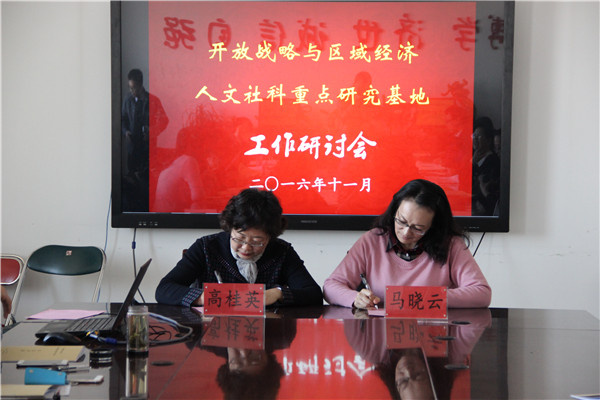 在任务分解协议书签署阶段,研究基地各子机构和研究方向负责人就基地的工作思路、管理办法和任务分解方案等内容展开了讨论。随后,基地负责人高桂英研究员与基地各研究方向负责人签署了《开放战略与区域经济人文社科重点研究基地建设期任务分解协议书》。