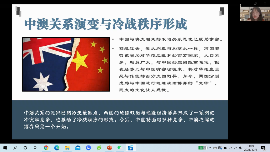 王瑛教授以在9·11二十周年回望世界秩序的失序开篇,指出“9·11”对美国经济层面的影响通过汇市、股市、大宗商品市场等机制向全球形成脉冲,间接为世界经济危机埋下伏笔,后“9·11”时代美中国力的此消彼长,也恰好奠定今日世界之格局;进而以中澳关系演变与冷战秩序形成为例,分析了目前中国目前面临的国际局势,认为中国今后肯定还会面对、遭遇一系列的竞争和对抗,中国与澳大利亚之间的博弈,仅仅是一个开始。因此,中国经济必须拿出行之有效的长策,否则很多想法、概念能谈不能做,能想无法做,最终还是流于空谈,这样将会无法持久。王老师最后从“为什么?”“是什么?”“怎么办?”等方面系统分析了“双循环”新发展格局的相关问题。