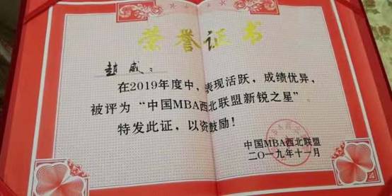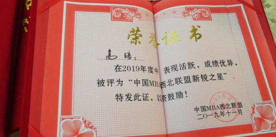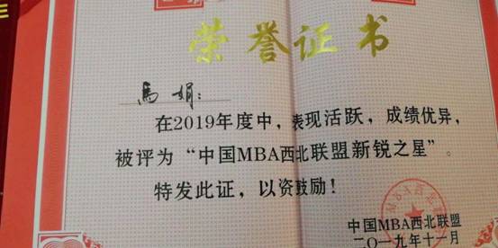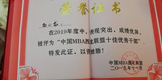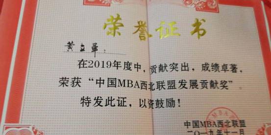 在2019年中国西北联盟主席峰会中被评为“十佳特色商学院”,我校黄立军教授荣获2019年度“中国MBA西北联盟发展贡献奖”,我校第九届MBA联合会主席白小龙被评为“中国MBA西北联盟十佳优秀干部”,我校MBA优秀学员马娟、高晧、赵威分别荣获“ 中国MBA西北联盟新锐之星”。