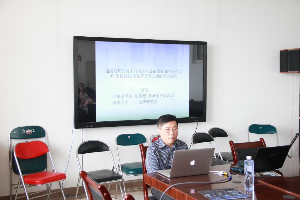 随后,罗凯副教授为到场师生做了题为“运营管理的若干前沿理论在葡萄酒产业链、生物制药、医院管理领域的应用”的学术报告。生动地介绍了法国葡萄酒业的历史及文化影响,图片展示了世界葡萄酒产业的规模,并提出探讨中法两国消费者行为影响因素的研究构想。罗副教授认为,通过收集实验数据进而形成最佳配方再量化生产的的运营方式大大提升了生物制药的效率。此后,他还通过临床实验流程管理的动态规划研究实例,强调了利用先进IT技术的运营管理对医院利润提升的重要作用。