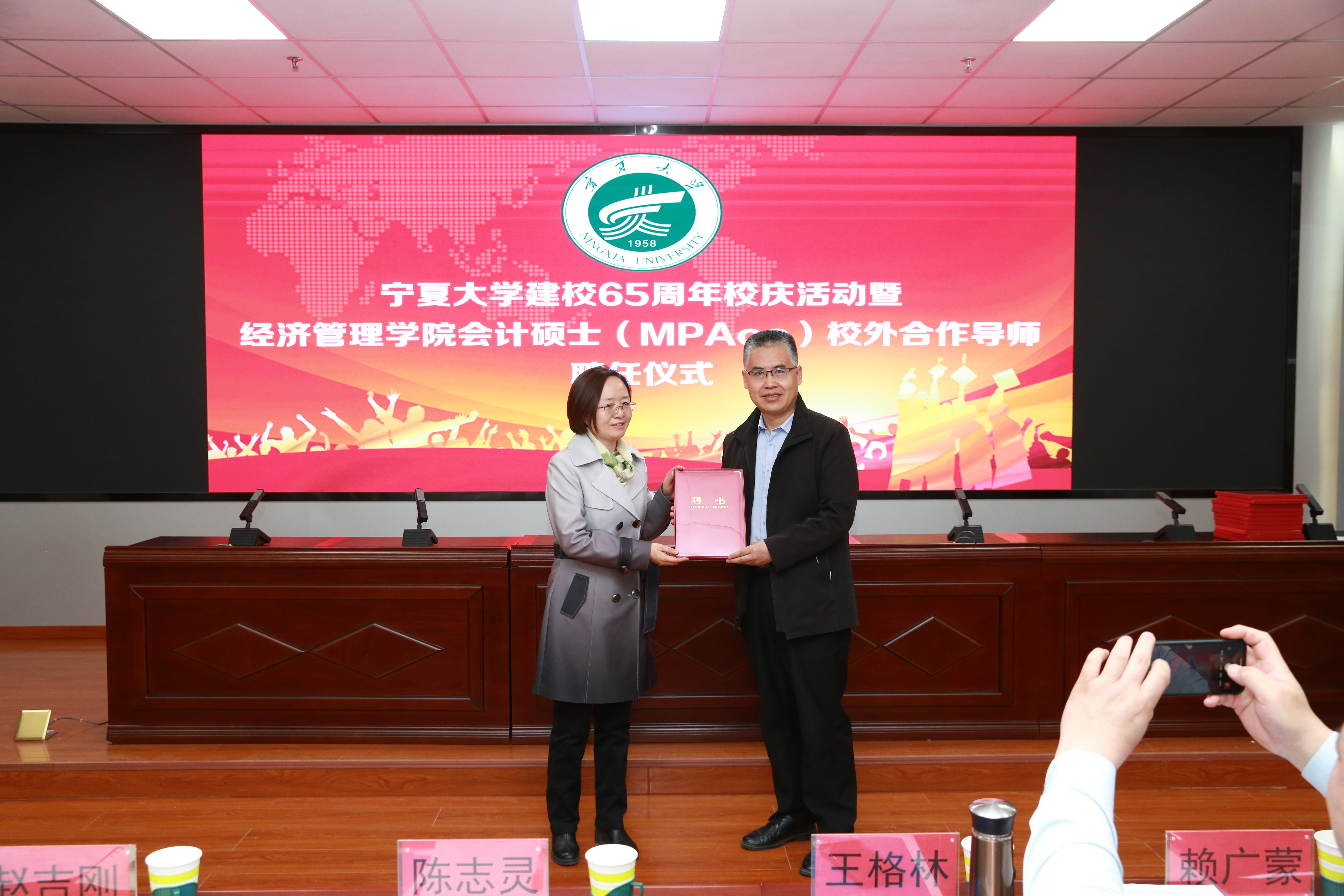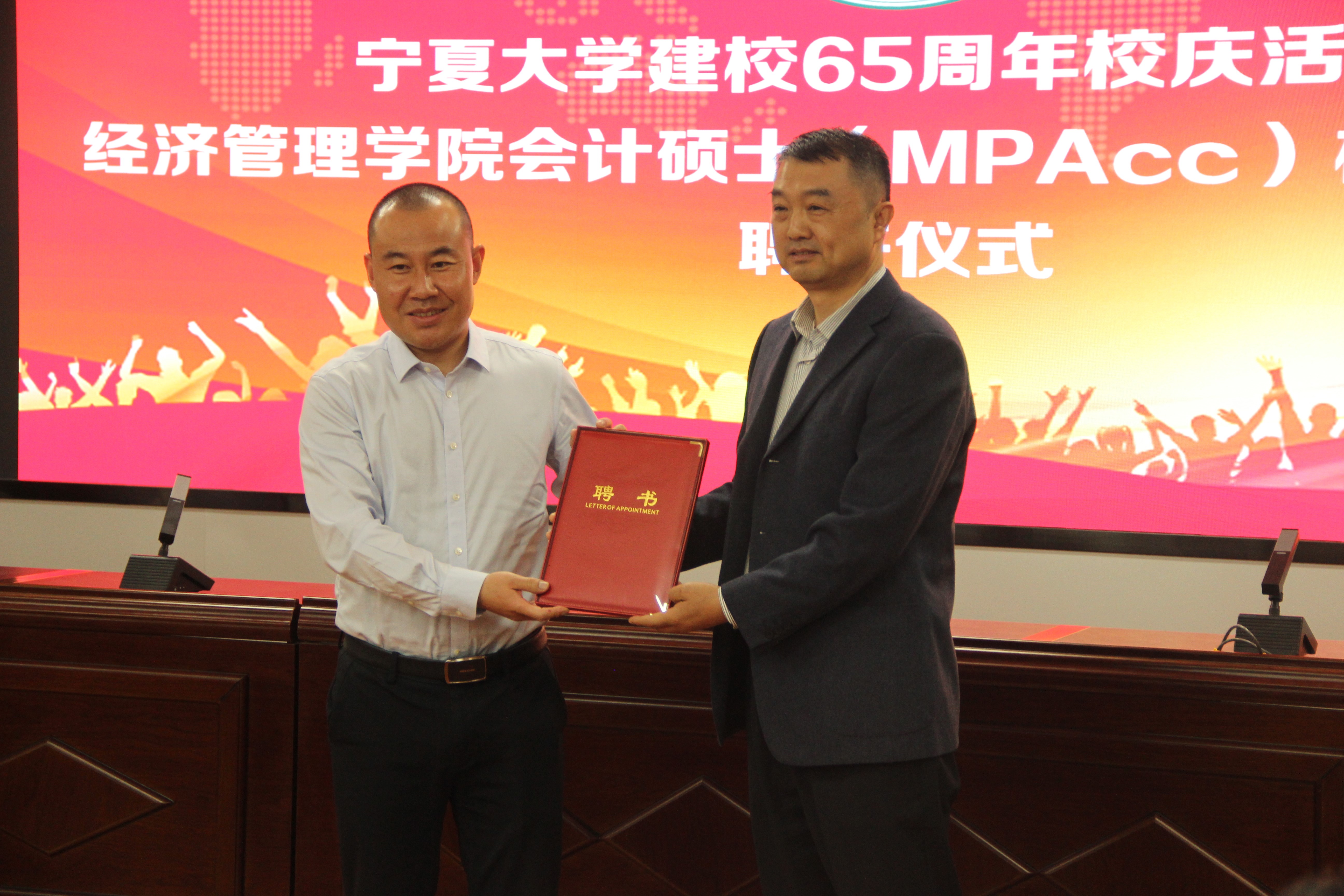 会议第三项内容是学院领导为校外导师颁发聘书。宁夏水投云澜科技股份有限公司董事长陈志灵,宁夏西北明天科技股份有限公司董事长赖广蒙,宁夏昊源联合会计师事务所所长牛建强,宁夏农垦集团和旅游集团外部董事王格林,自治区国资委党群部副处长赵吉刚,天华(宁夏)会计师事务所首席合伙人王海智,宁夏银行石嘴山分行副行长丁自明,中和资产评估有限公司宁夏瑞衡分公司副总董文忠,信永中和会计事务所银川分所合伙人梁建勋,宁夏宁东融资担保有限公司综合办公室主任龙鹏程,上陵牧业董事长秘书沈致君,宁夏昊源联合会计师事务所项目经理张凤莉,宁夏银行股份有限公司资深营销专员夏会云,受聘成为亚新体育