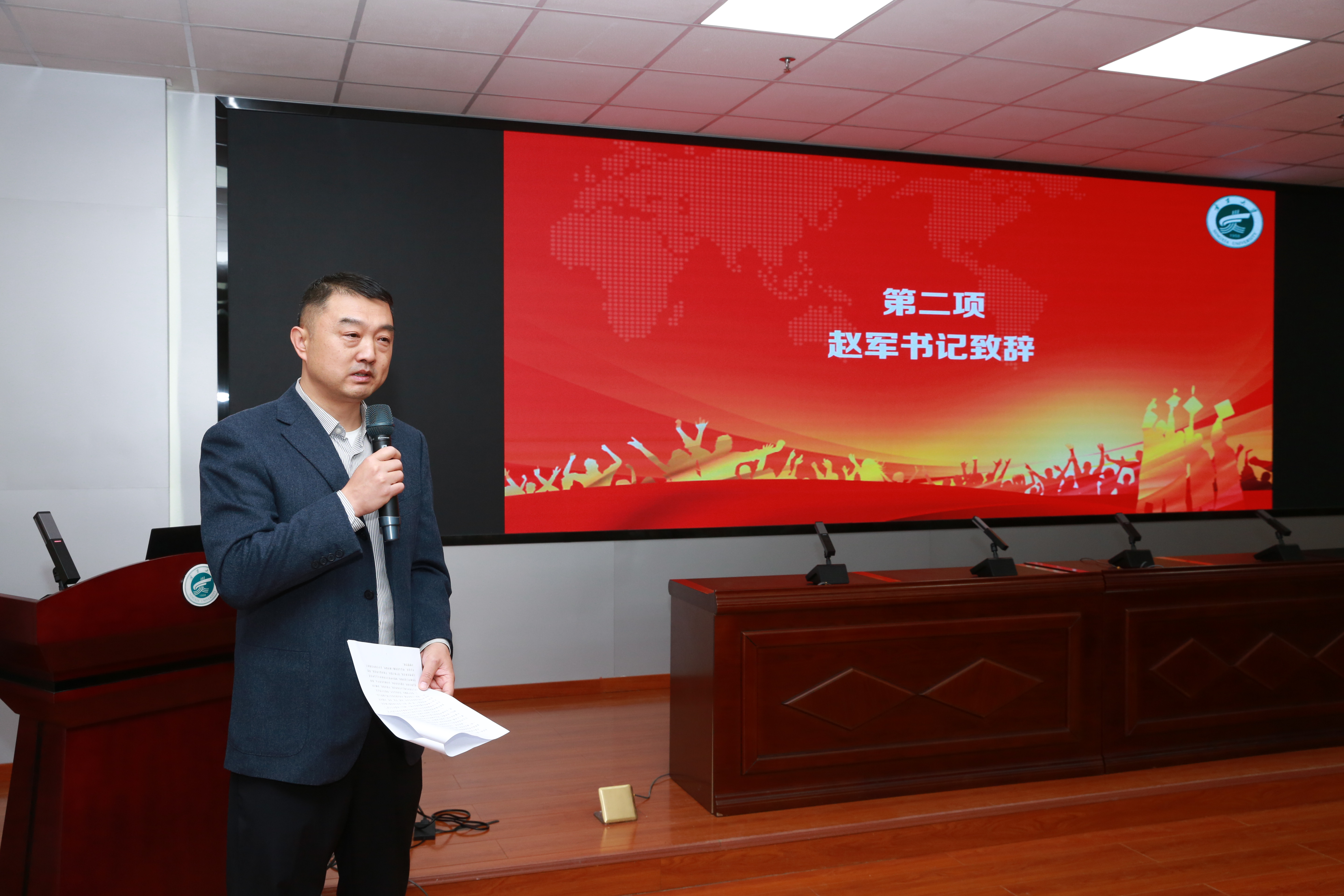 会议第二项内容是学院党总支书记赵军教授致辞。赵书记介绍了学院在师资队伍、学科发展、专业建设、人才培养等方面的进展,表达了进一步推进多方面合作的期待,宣读了学院柔性引进人才实施办法并为受聘导师颁发聘书。
