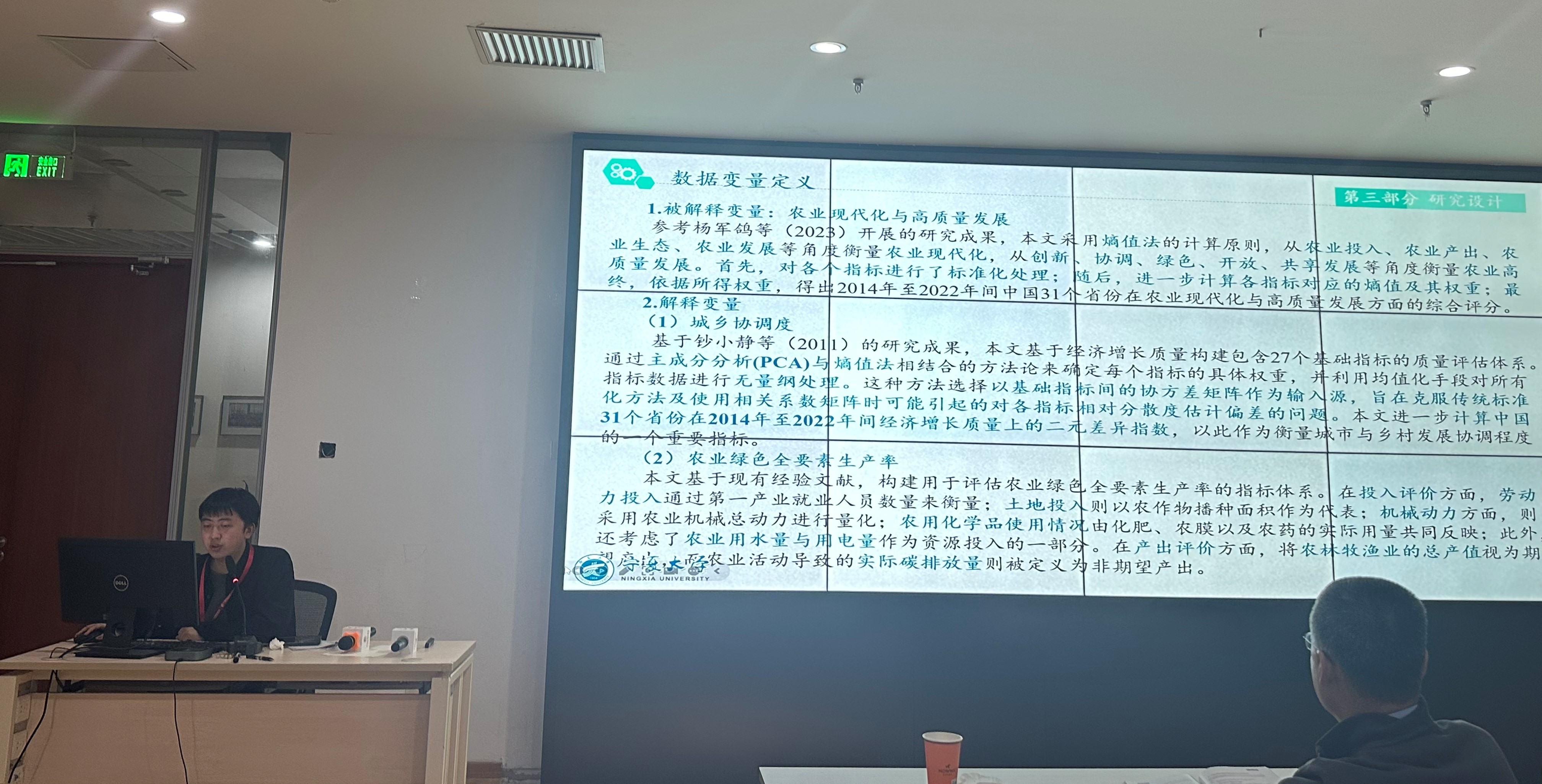 研究生刘晓斌报告论文题为《黄河流域养殖户绿色生产效率与最优养殖规模测度——基于C-D生产函数和门槛回归的实证分析》。论文以黄河流域肉羊养殖户为研究对象,基于宁夏、陕西、甘肃3省(区)1194户养殖户实地调查数据,对养殖户绿色生产效率进行测算,并使用门槛回归模型,探究影响效率水平的关键因素及能够实现最高效率水平的最优养殖规模。研究结论如下:一是养殖户技术效率水平较高,不同地区间差异较小;配置效率和成本效率水平较低,且不同地区间存在显著差异。二是养殖规模对配置效率和成本效率水平均具有促进作用,且存在双重门槛值。三是养殖规模的扩大通过提高养殖户规范化养殖认知水平和采纳疫病传播预防行为可能性来促进其效率水平的提高。