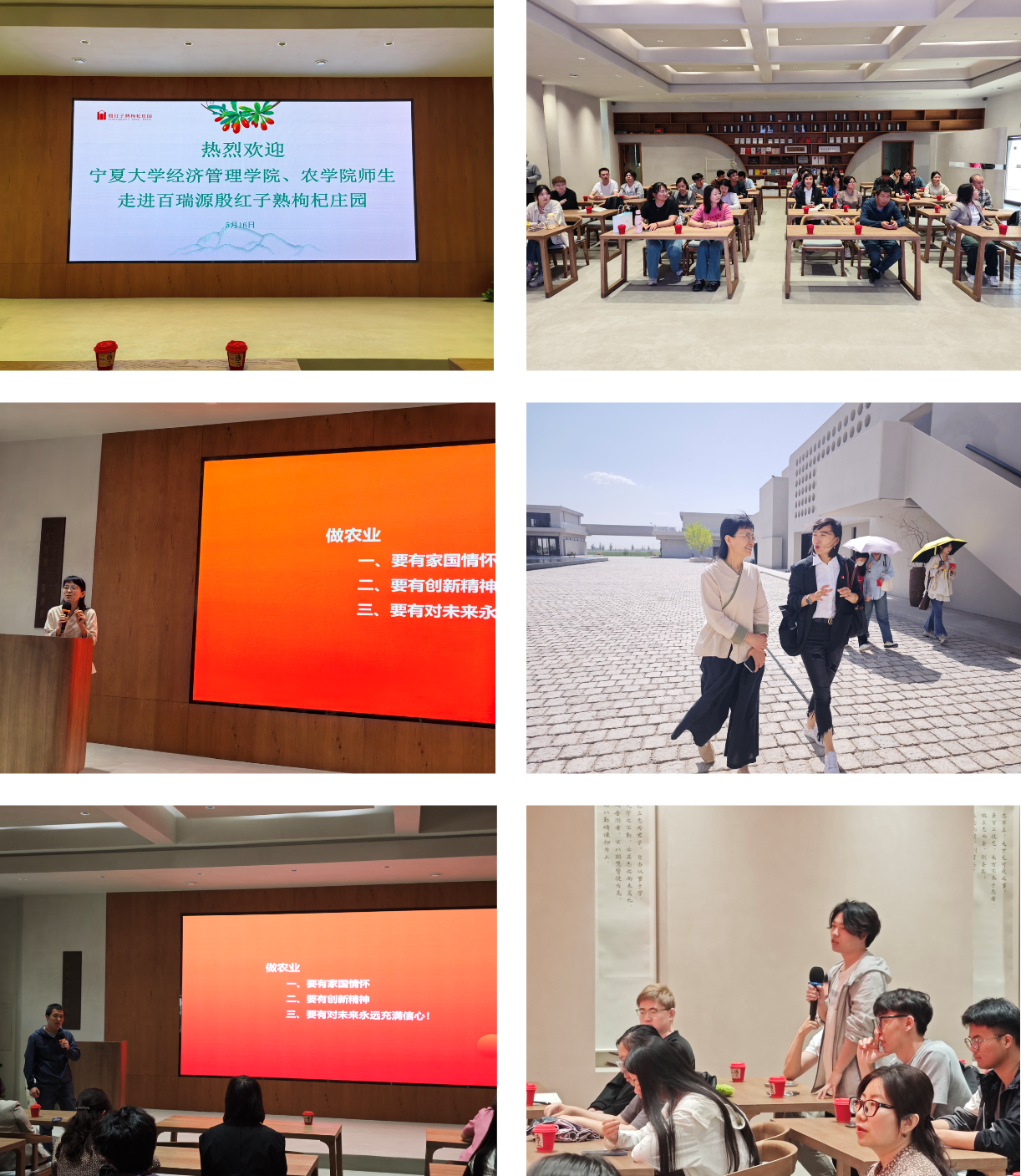 上午9时,师生一行抵达第一站——百瑞源殷红子熟枸杞庄园。这座灰白建筑群与1500多亩枸杞田相映构成田园综合体,是以唐代诗人刘禹锡“殷红子熟照铜瓶”为灵感打造的文化地标。庄园打破传统展馆模式,以开放式场景体验为核心,打造集种植观光、艺术打卡、研学食宿于一体的“枸杞生活共同体”。一号馆“明心堂”采用极简主义建筑风格与水景设计营造出禅意空间,师生在会议室“知行学堂”开展现场教学研讨交流,农林经济管理教工党支部书记王琳瑛老师结合课程指出:“乡村振兴不仅是产业升级,更是文化与生态价值的再发现。百瑞源以艺术赋能田园,为‘农业+文旅’提供了新范式。”百瑞源殷红子熟枸杞庄园庄主郝晓琴在座谈中言道:“做农业,一要有家国情怀;二要有创新精神;三要对未来永远充满信心。”农学院教工党员代表侯贤清老师即兴发言:“感谢百瑞源殷红子熟枸杞庄园,让师生们近距离感受党建引领下特色产业的创新活力。通过支部结对共建、学科优势互补,探索服务特色产业的精准方案。”当看到百瑞源通过“五位一体”模式实现从种植、研发到文旅的产业闭环时,学生们深刻体会到“一粒枸杞”背后的品牌升级密码,农林经济管理专业5位研究生同学积极踊跃提问,在产业发展、品牌打造、淡季破圈等各个方面与郝庄主进行互动。