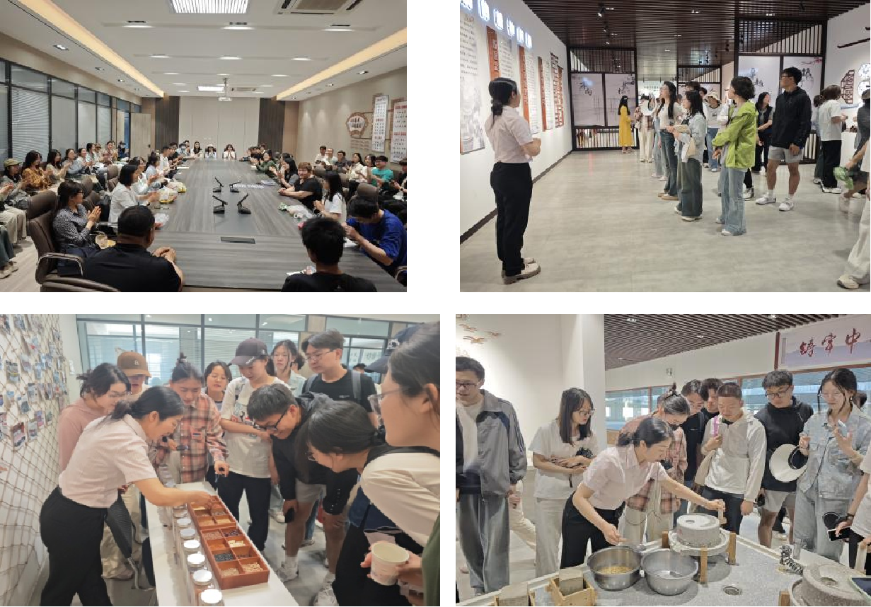 第二站,师生们来到了宁夏兴豆缘豆制品有限公司,对传统豆腐制作技艺、豆制品深加工设备以及公司的发展历程等进行深入了解。豆腐,这一凝聚东方智慧的食品,不仅富有营养,而且承载着中华传统文化和美好的寓意。兴豆缘的豆腐文化馆通过沉浸式展陈、互动体验等形式,完整呈现豆腐这一中华美食从起源到现代产业化的发展历程。师生们在工作人员的带领下感知了豆腐历史、体验了石磨磨豆的古法技艺、品尝了鲜豆浆和豆腐、参观豆腐生产车间,见证传统工艺与现代科技的完美融合。公司创始人张桂红女士和师生们亲切座谈交流,用质朴的话语讲述了民营企业家的创业卓见——质量是企业制胜的法宝。