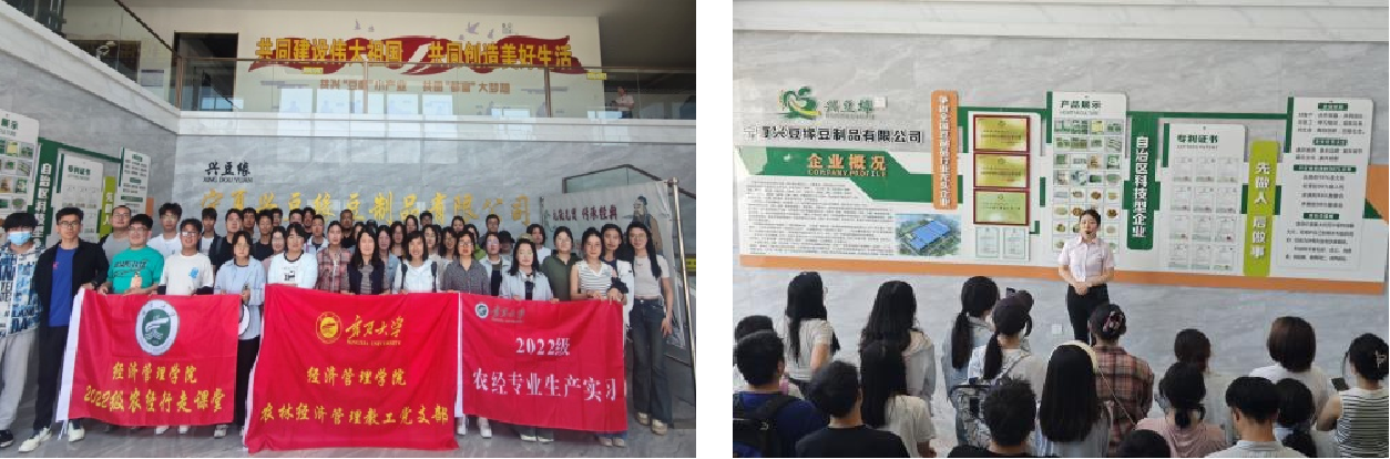 2022级农林经济管理专业40名本科生开展“行走课堂”,实地走访宁夏塞外香食品有限公司、宁夏兴豆缘豆制品有限公司、西鸽酒庄及宁夏顺宝现代农业股份有限公司。农林经济管理教工党支部书记王琳瑛、支部党员樊新刚、杨钰莹、韩秀丽参与此次活动。通过现场观摩、技术讲解与互动研讨,学生们深入探究了宁夏特色农产品全产业链发展的现状、挑战及展望。以“党建+实地调研”的形式,将传统课堂转变为移动课堂,在田野中把握乡村振兴背景下现代农业的实现路径,扎实推动理论学习与实践教育深度融合。
