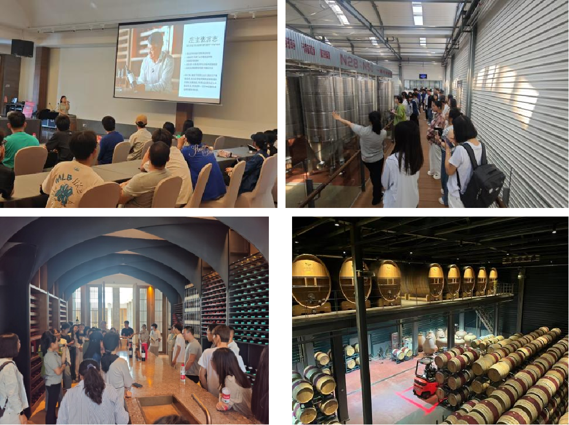 第三站,师生们来到了西鸽酒庄。庄主张言志于2017年建立了西鸽酒庄,2023年晋升至二级酒庄,实现3.2万亩自有葡萄园,是一座集葡萄种植、葡萄酒酿造、文化体验和艺术展示于一体的综合性精品酒庄。师生们跟随工作人员的脚步在红酒品鉴区和文化区了解各类红酒产品、酒庄特色葡萄品种以及葡萄种植技术,并且在葡萄酒生产区以及酒窖进行参观学习。师生们无不被酒庄生产规模的壮观和现代科技的融入所震撼。从葡萄种植到酿造工艺,“3126”酿酒法则的每个环节都体现着西鸽人精益求精的工匠精神,让师生们领略了葡萄酒产业的独特魅力。现场座谈会上,师生们踊跃发言,思想碰撞的过程中彰显出西鸽酒庄“让世界爱上中国葡萄酒”的国际视野。
