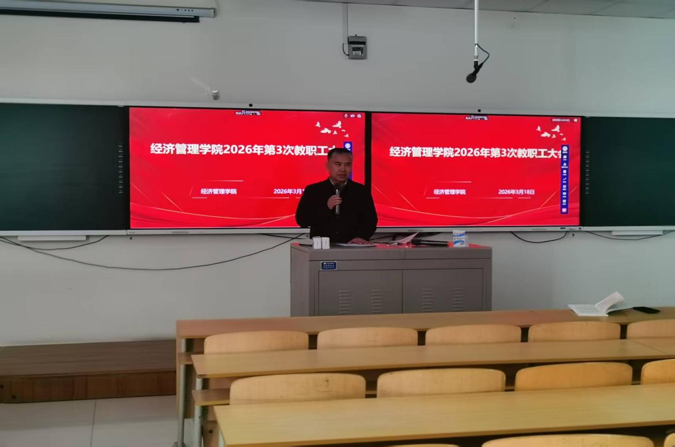 杨国涛院长带领学习习近平总书记在两会上的讲话,解读2026年政府工作报告主要目标指标、重大战略任务及重点工程项目,号召全体教职工团结在党中央周围,以习近平新时代中国特色社会主义思想为指导,将国家发展大局与学院教学科研工作紧密结合,奋力实现全年目标,确保“十五五”良好开局。