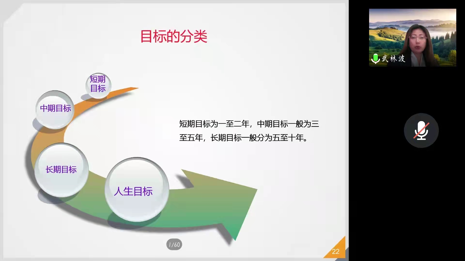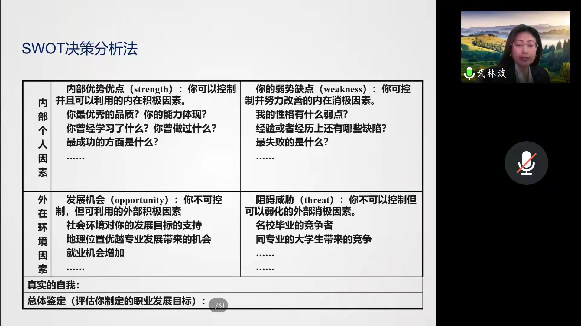 武林波通过SWOT分析讲解,希望同学们运用科学理论充分了解自己的优劣势,分析自己可能面临的职业机会和威胁,并以此制定出五年内的职业目标和行动计划。她建议同学们可以运用SMART原则明确目标,并通过讲述山田本一的事例告诫同学们制定目标不要好高骛远,应该循序渐进,明确长期目标是几个短期目标的结合。