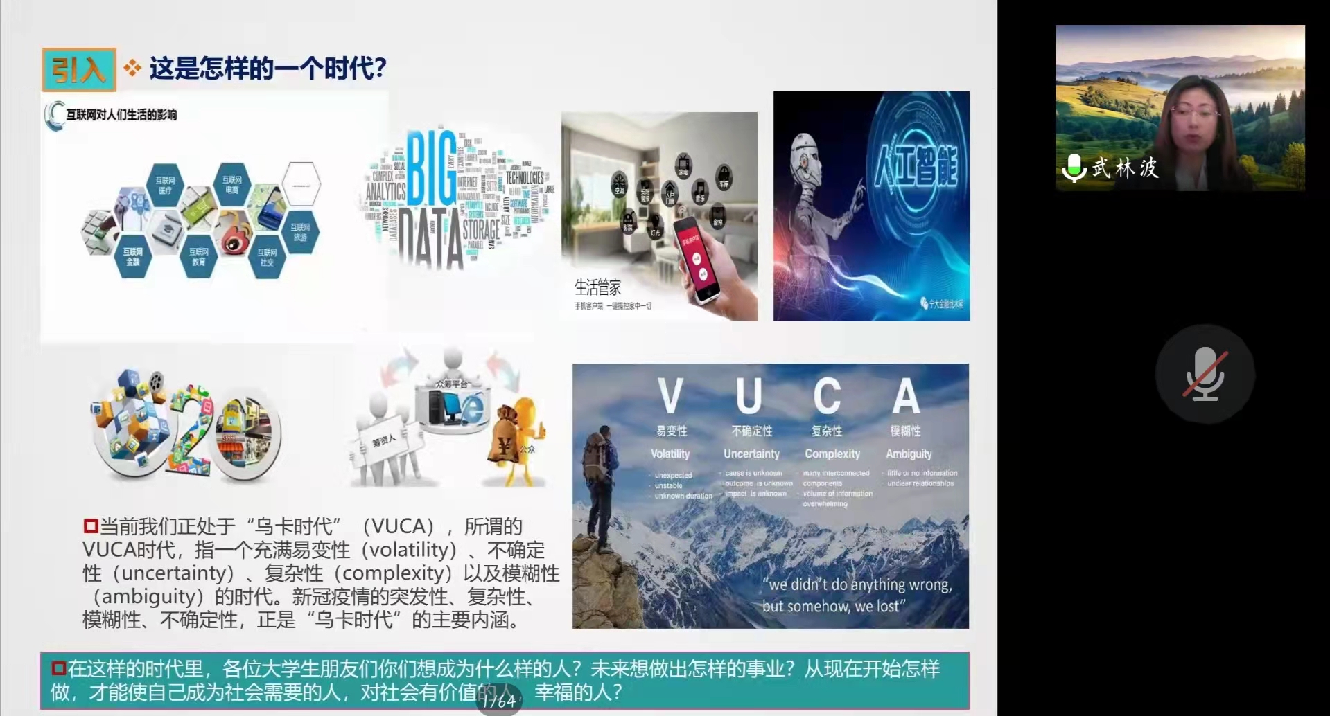 武林波以一个引人深思的问题“这是一个怎样的时代?”启发同学们思考,在与同学们互动过后,她表示,我们现在正处于“乌卡时代”,通过分析哈佛商学院的事例,全面讲解了“乌卡时代”易变、不确定、复杂及模糊的主要内涵,以此点明职业规划的重要性。随后,她详细介绍了职业规划的内涵。武林波表示,科学的职业生涯规划是实现理想与目标的重要手段之一,职业生涯设计要择己所爱、择己所长、择世所需、择己所利。