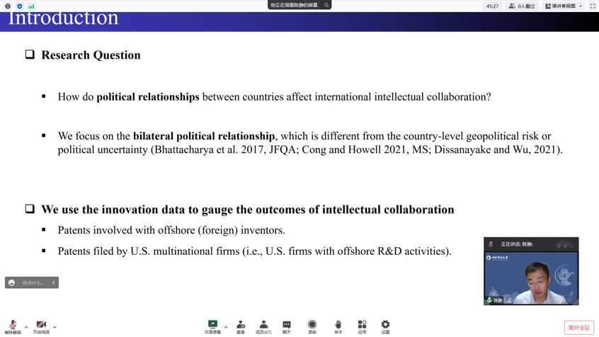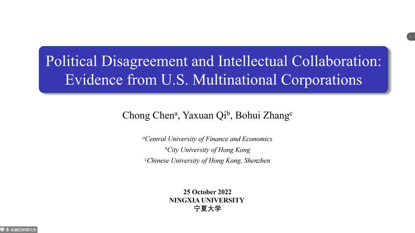 特邀中央财经大学中国金融发展研究院长聘助理教授、香港城市大学金融学博士、国家自然科学基金青年项目主持人陈翀老师带来题为《Political Disagreement and Intellectual Collaboration: Evidence from Global Innovation of U.S. Multinational Corporations》的学术讲座,亚新体育