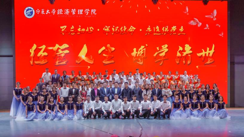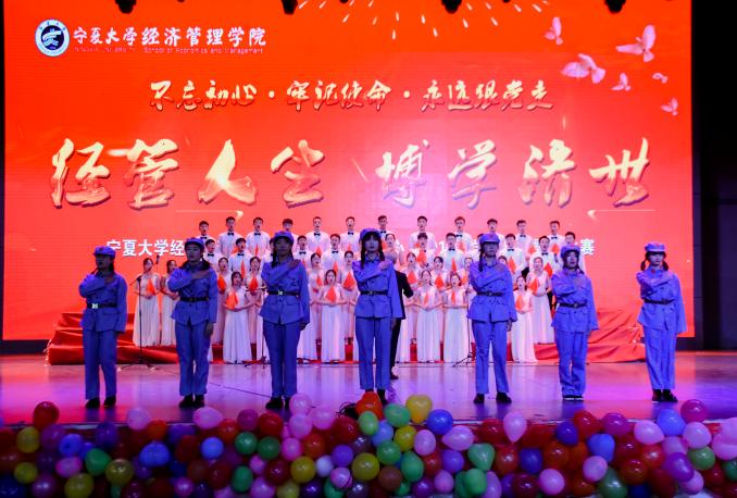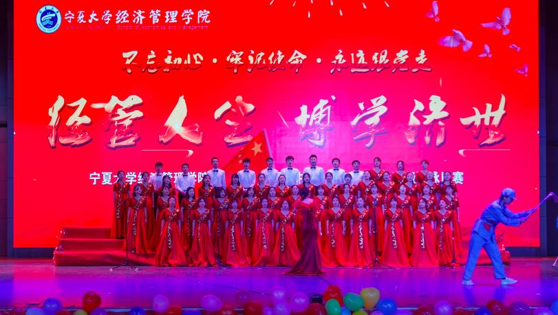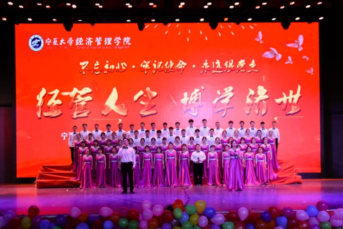 《没有共产党就没有新中国》,中国共产党一经成立,就义无反顾肩负起实现中华民族伟大复兴的历史使命。在数年的时局动荡下,《中国军魂》谱写了一曲曲中华赞歌。1949年10月1日,《当那一天来临》,中国人民真正地《站起来》了,从此中华民族踏上了繁荣富强的《征程》。一颗中国心,一生中华情。“《我和我的祖国》,一刻也不能分割”“家是最小国,国是千万家,我爱我的国,我爱我的家”,唱至副歌部分时,同学们高亢的歌声点燃了台下的观众,全场大合唱让人心潮澎湃。《我们都是追梦人》,《奔跑》在《阳光路上》,深情唱响《我爱你,中国》。每首歌的背后都是共产党人的心血,每一声旋律都声动梁尘,震撼着每一位听众的心。演毕,全场掌声雷动,喝彩声不绝于耳。最后,由学院教师代表付森、刘涛、虎兴武、程胜利和经管辩论队带来的《为你读诗—中国礼赞》再次掀起了全场高潮,他们铿锵有力的朗读声久久回荡在会场上空。