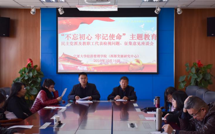 于贺兰山校区文荟楼904教室举办“不忘初心,牢记使命”主题教育民主党派及教职工代表征集意见座谈会。学院民主党派教师及教职工代表参加了座谈会。会议由院长杨国涛主持。