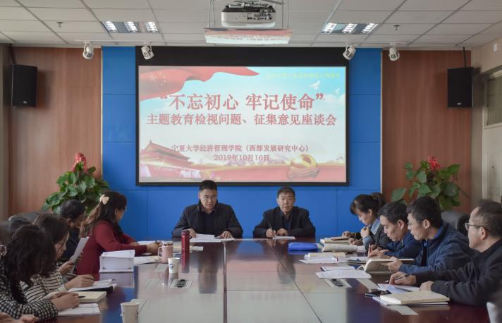 于贺兰山校区文荟楼904教室举办“不忘初心,牢记使命”主题教育检视问题暨征集意见座谈会。中心组成员,三办主任,系主任,支部书记及行政坐班人员到场参加。会议由院长杨国涛主持。