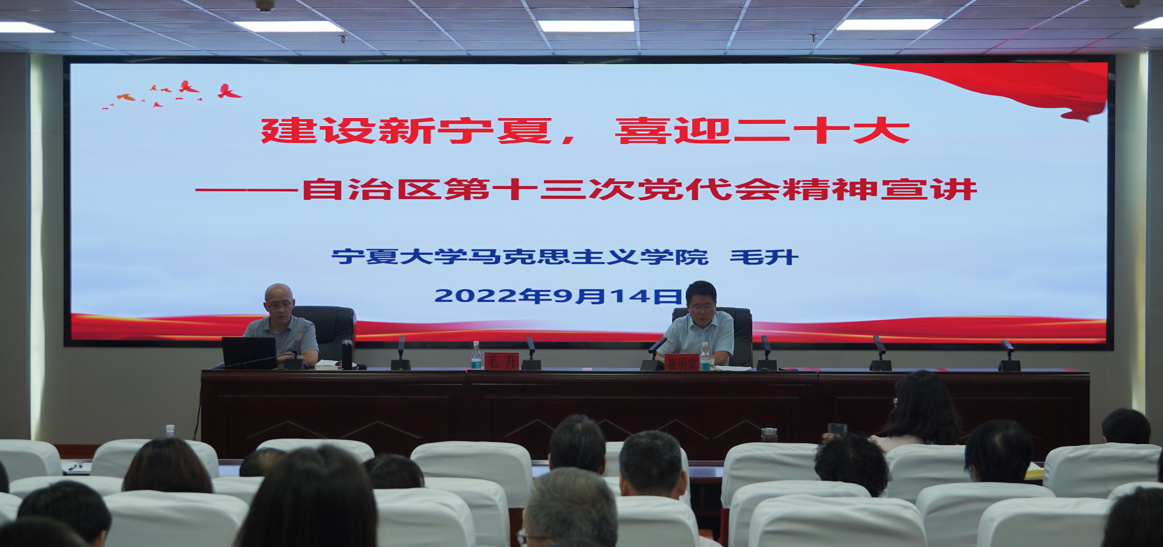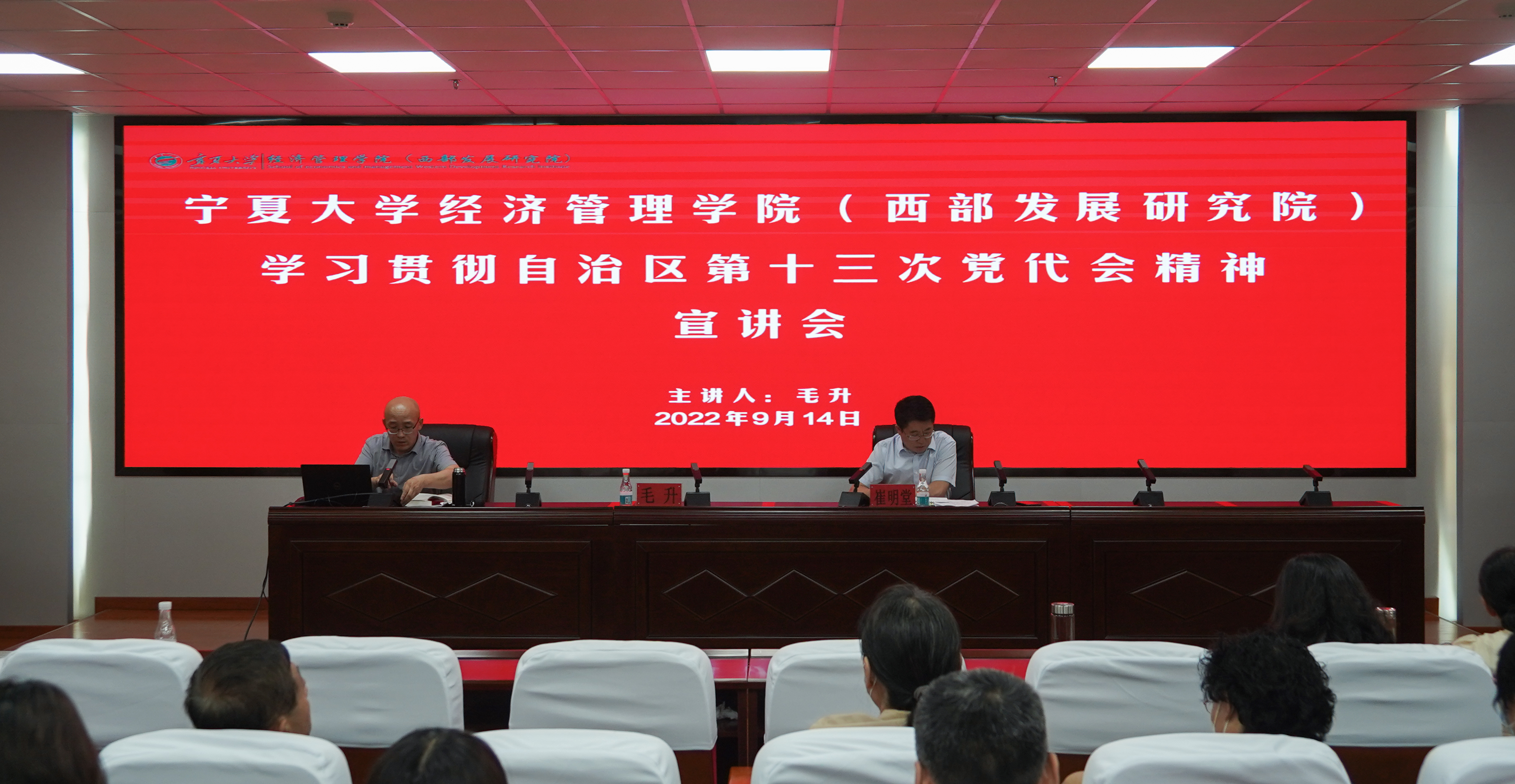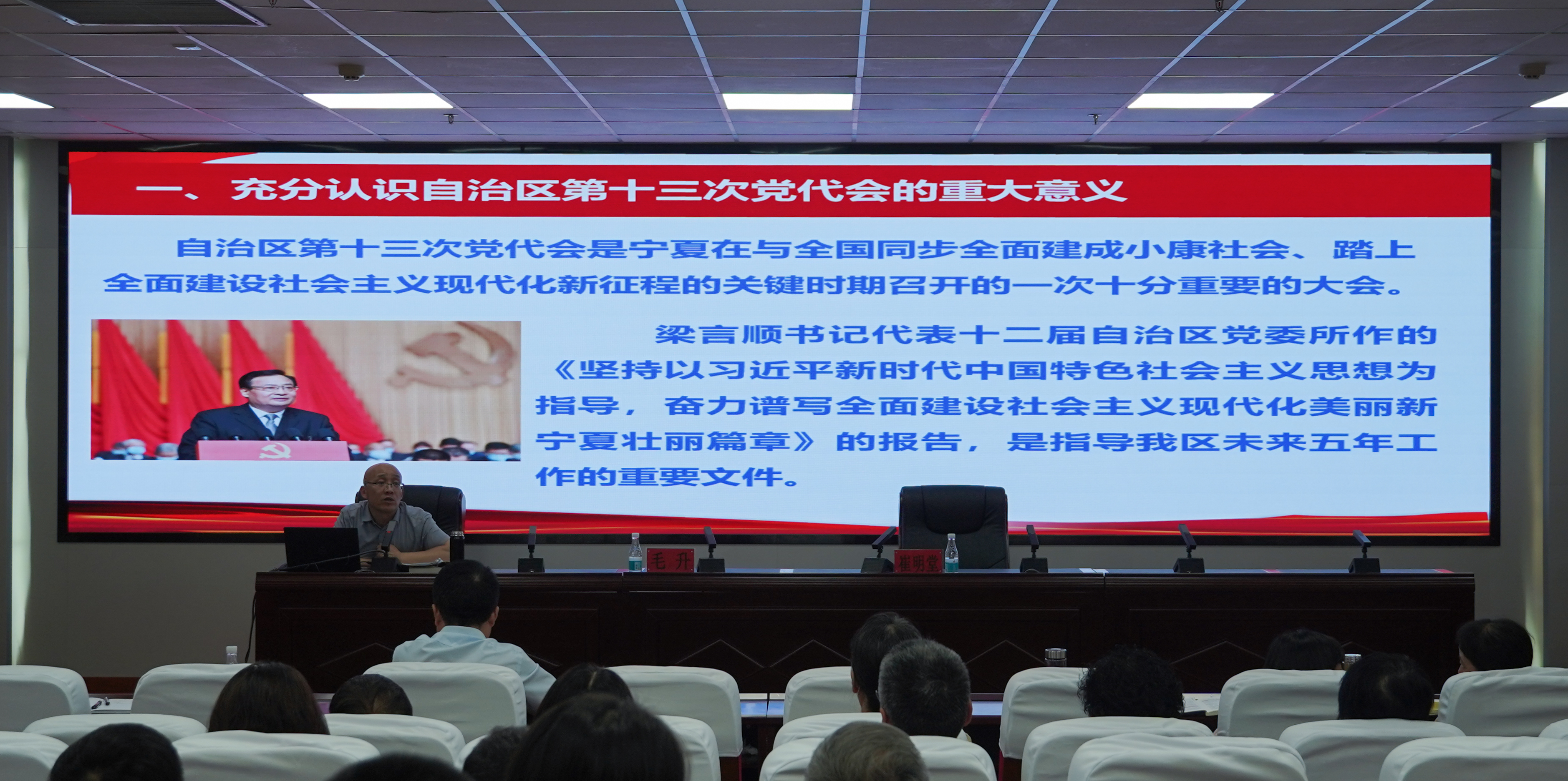 毛升表示自治区第十三次党代会是宁夏在与全国同步全面建成小康社会、踏上社会主义现代化新征程的关键时期召开的一次重要大会,是一次牢记领袖嘱托、感恩奋进新征程的大会,是一次描绘美好蓝图、凝心聚力谋发展的大会,是一次提振信心决心、团结奋斗开新局的大会,是一次激发时代担当、真抓实干谱新章的大会。毛升指出,大会进一步明确了宁夏发展的统领问题,进一步明确了宁夏发展的使命任务,进一步明确了宁夏发展的精神支柱,进一步明确了宁夏发展的奋进目标,大会总结了过去五年宁夏在政治建设、脱贫攻坚、疫情防控等方面取得的巨大成就,未来,宁夏将在产业转型升级、生态环境建设、城乡区域协调发展、民生工作、社会治理机制方面持续发力。并详细解读了“五个坚持”、“九大支撑”、“五个进一步”、“六个建设”的丰富内涵。毛升表示,未来属于青年,希望寄予青年,各位要争当伟大理想的追梦人,争做伟大事业的生力军,勇做新时代的弄潮儿。