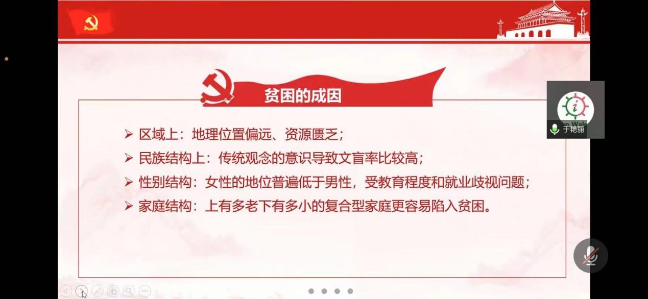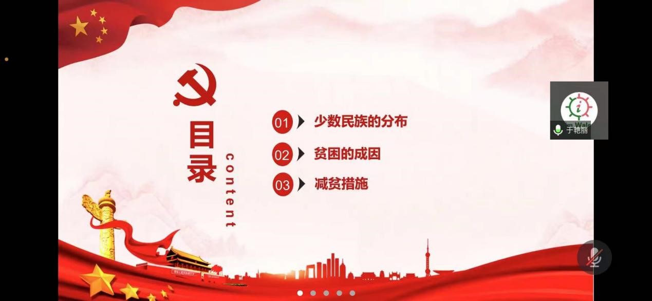 会议伊始,于艳丽从少数民族分布、贫困成因、减贫措施三方面强调了铸牢中华民族共同体意识的重要意义,呼吁同学参与到促进民族团结的行动中,发挥党员先锋模范作用,引导支部党员树立休戚与共的共同体理念。随后,各党小组同学结合自身经历分享了自己对铸牢中华民族共同体意识的认识与感悟。
