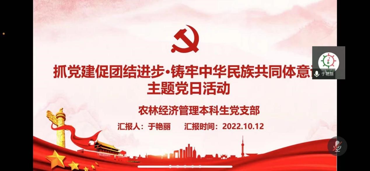 10月12日,农林经济管理本科生党支部召开“抓党建促团结进步·铸牢中华民族共同体意识”主题党日活动。农林经济管理本科生党支部书记于艳丽及党支部全体党员参加,会议由学生党员杨艺帆主持。