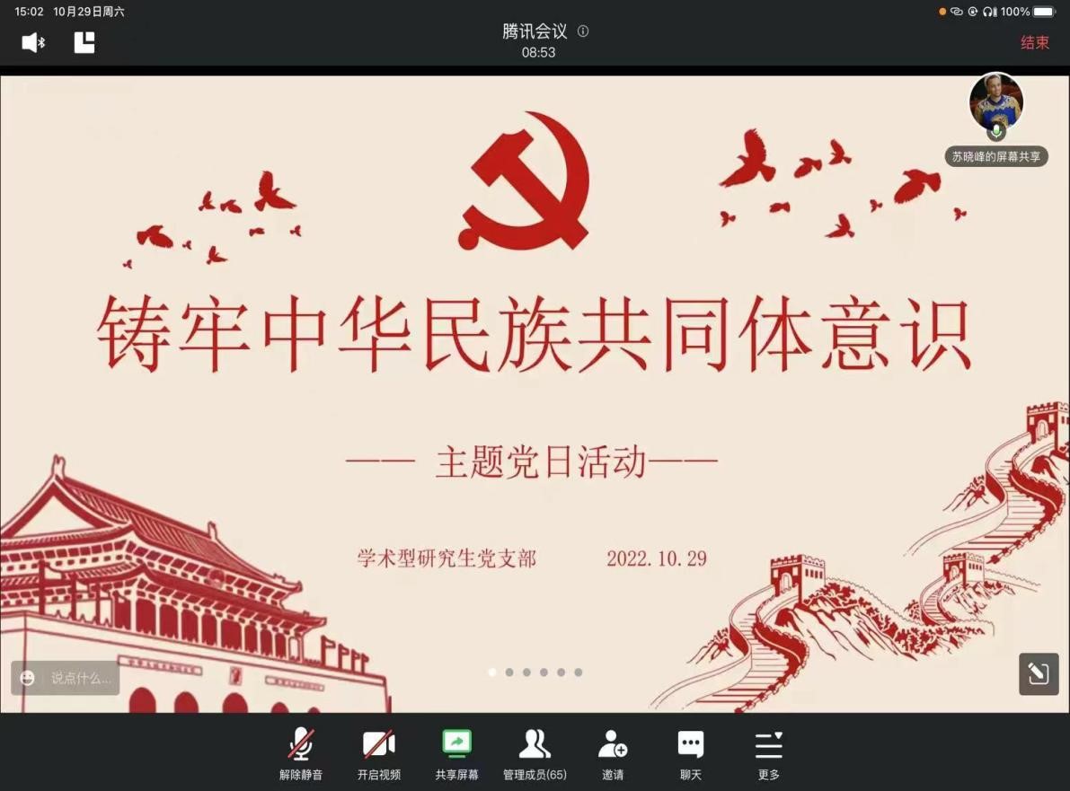 10月29日下午,亚新体育 学术型研究生党支部“铸牢中华民族共同体意识”主题党日活动在线上顺利召开。党支部全体党员、发展对象及积极分子参加会议,会议由党支部副书记苏晓峰主持。