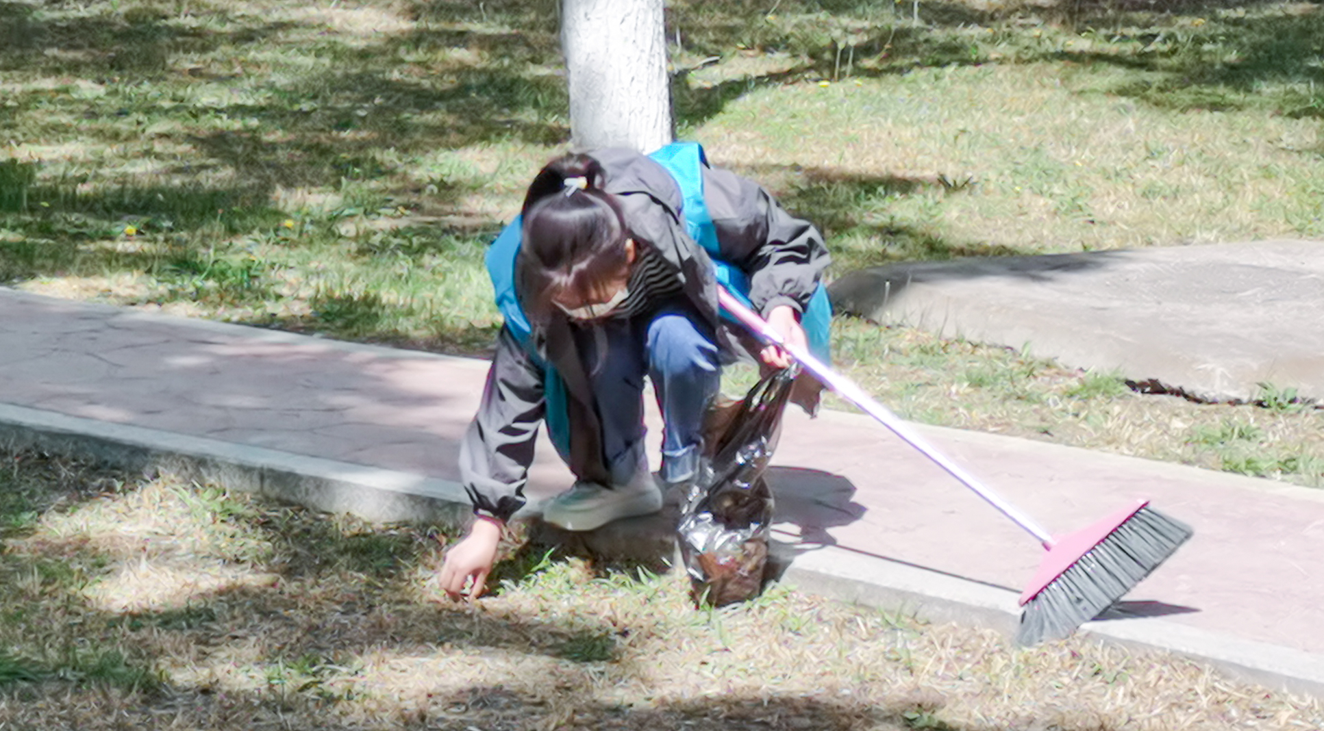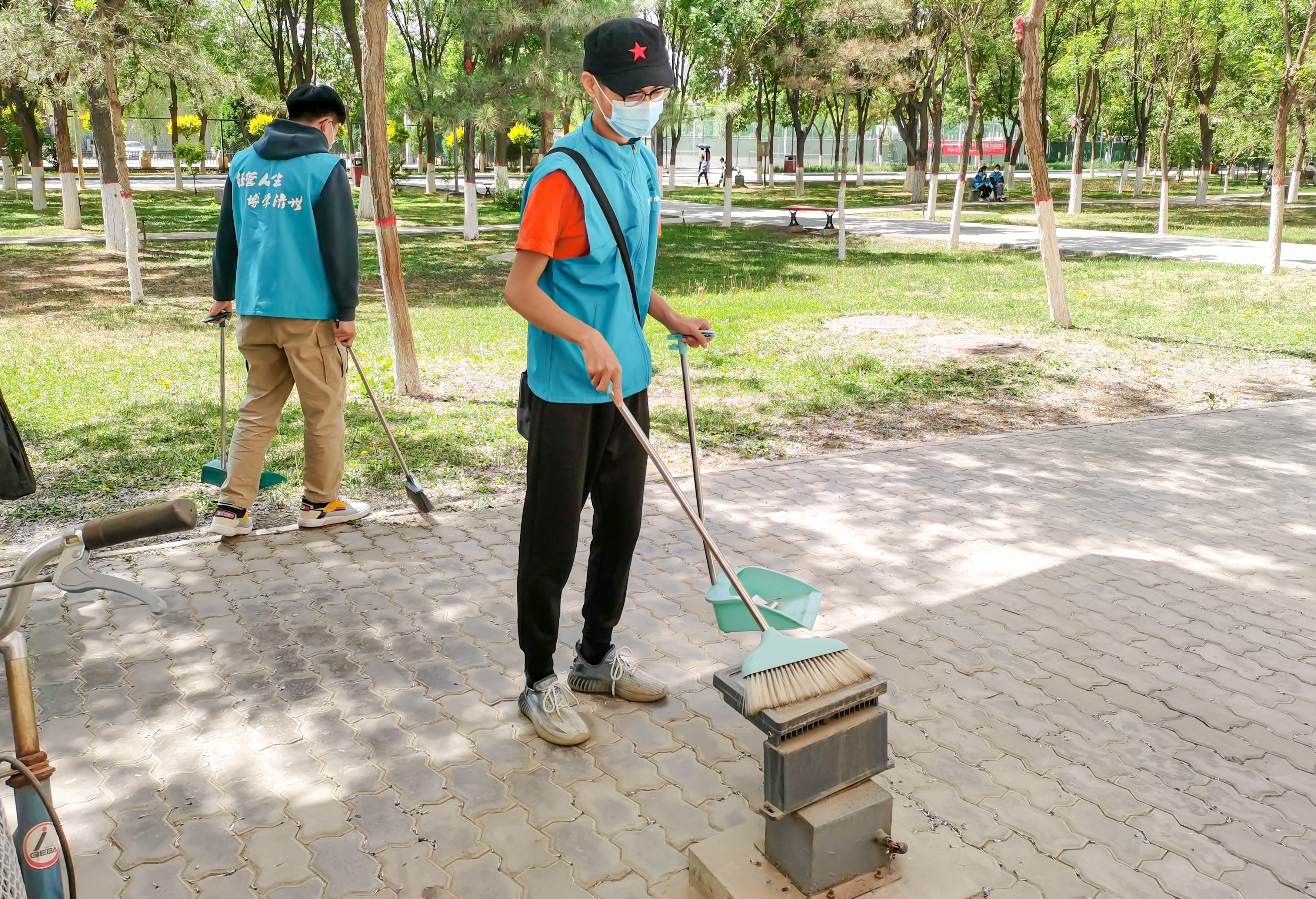 活动中,志愿者们身穿志愿服装,分工合作,认真清扫地面垃圾,并对花园死角进行彻底清理。