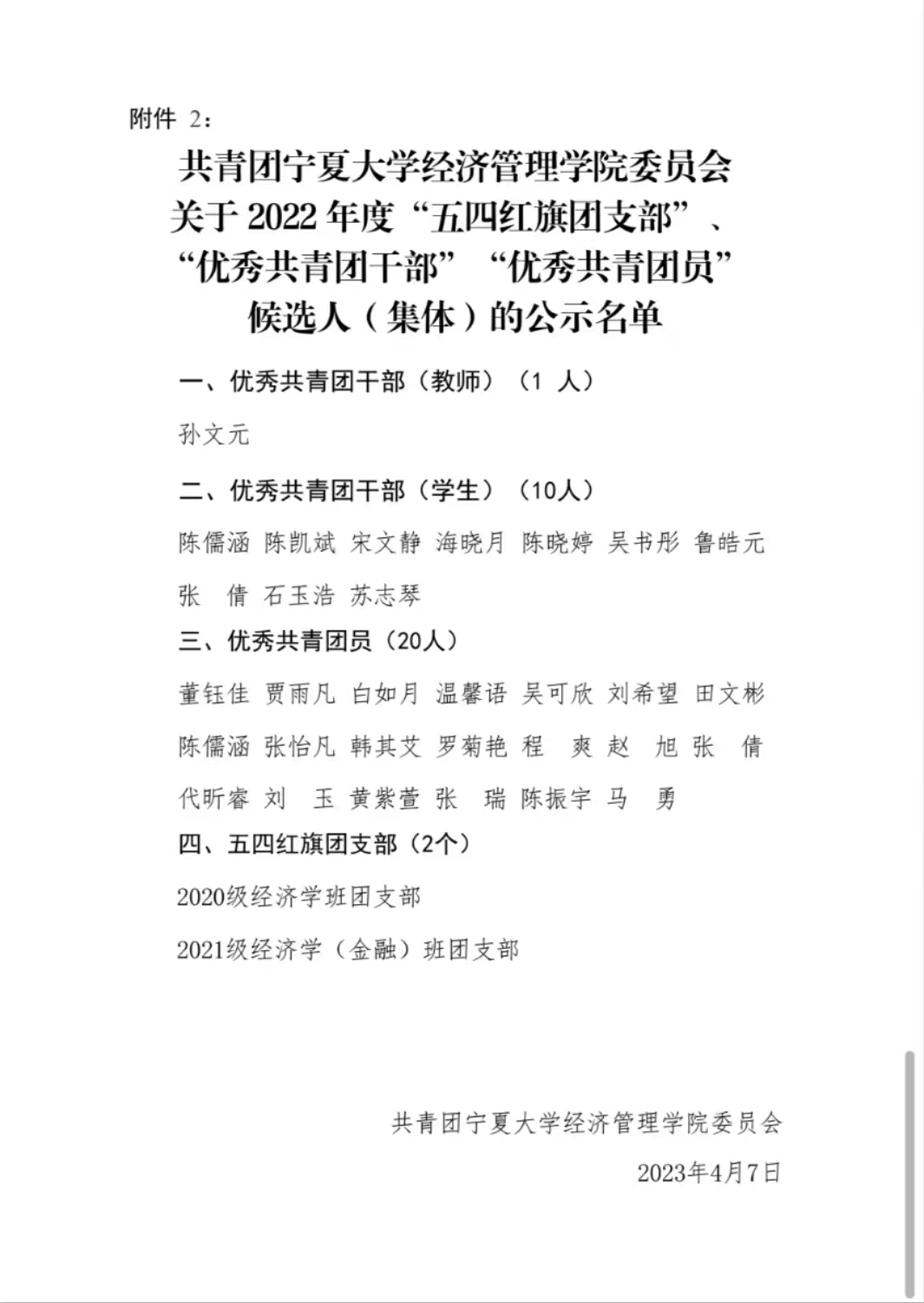 委员会2021级经济学(金融)班团支部等2个团支部为五四红旗团支部候选集体;宋文静、陈凯斌、陈儒涵等10名同学为优秀共青团干部(学生)候选人;董钰佳、吴可欣、赵旭等20名同学为优秀共青团员候选人。具体名单如下公示: