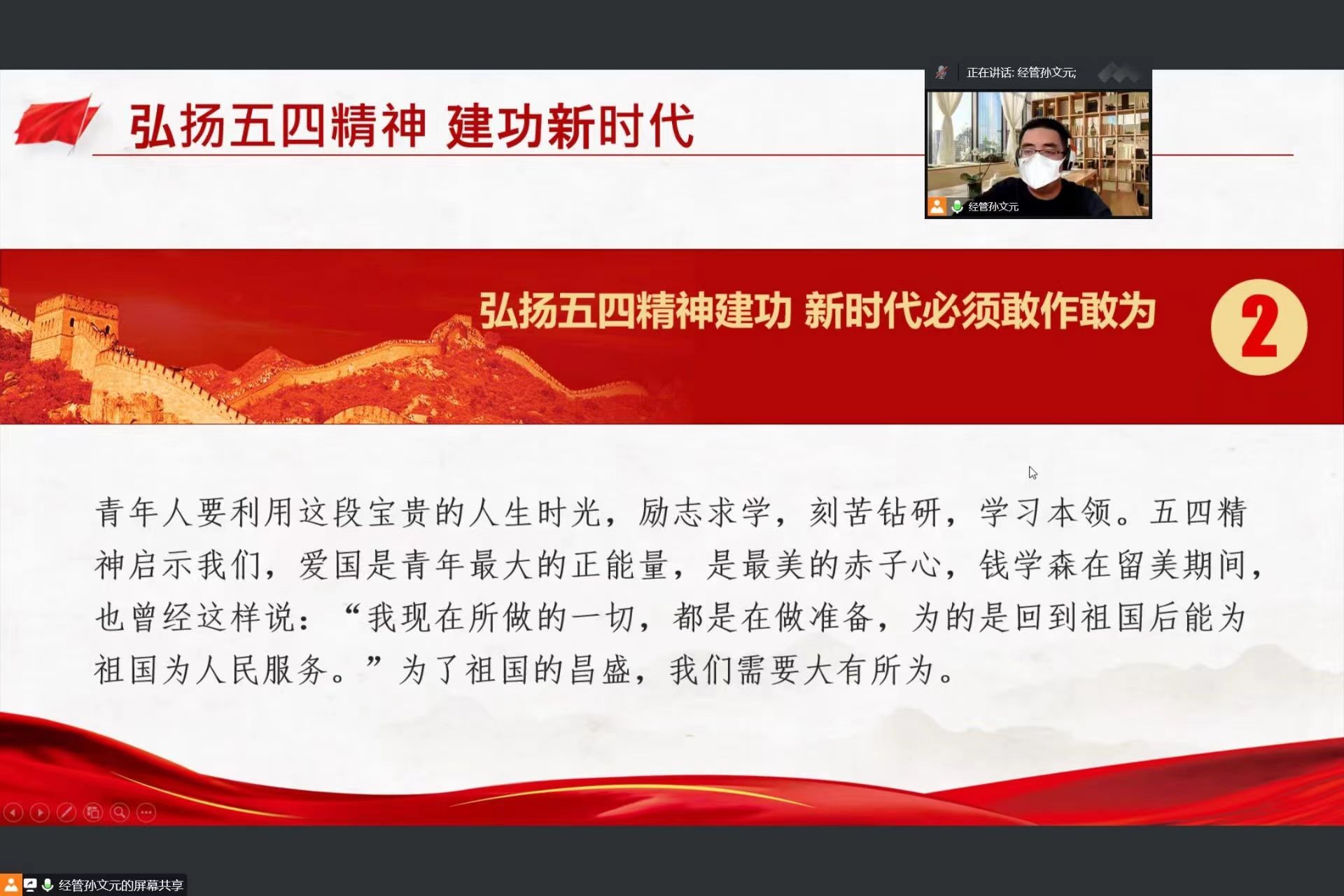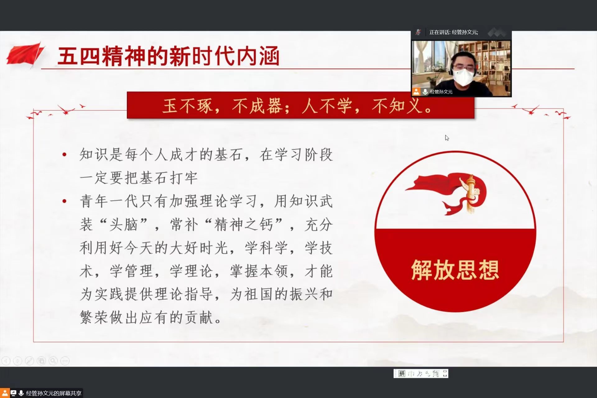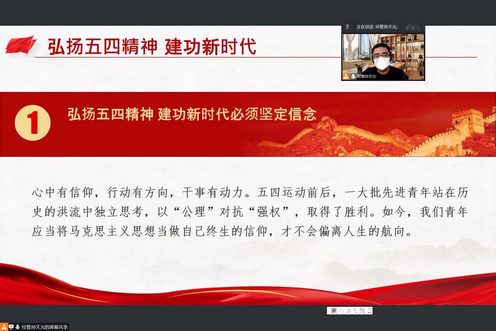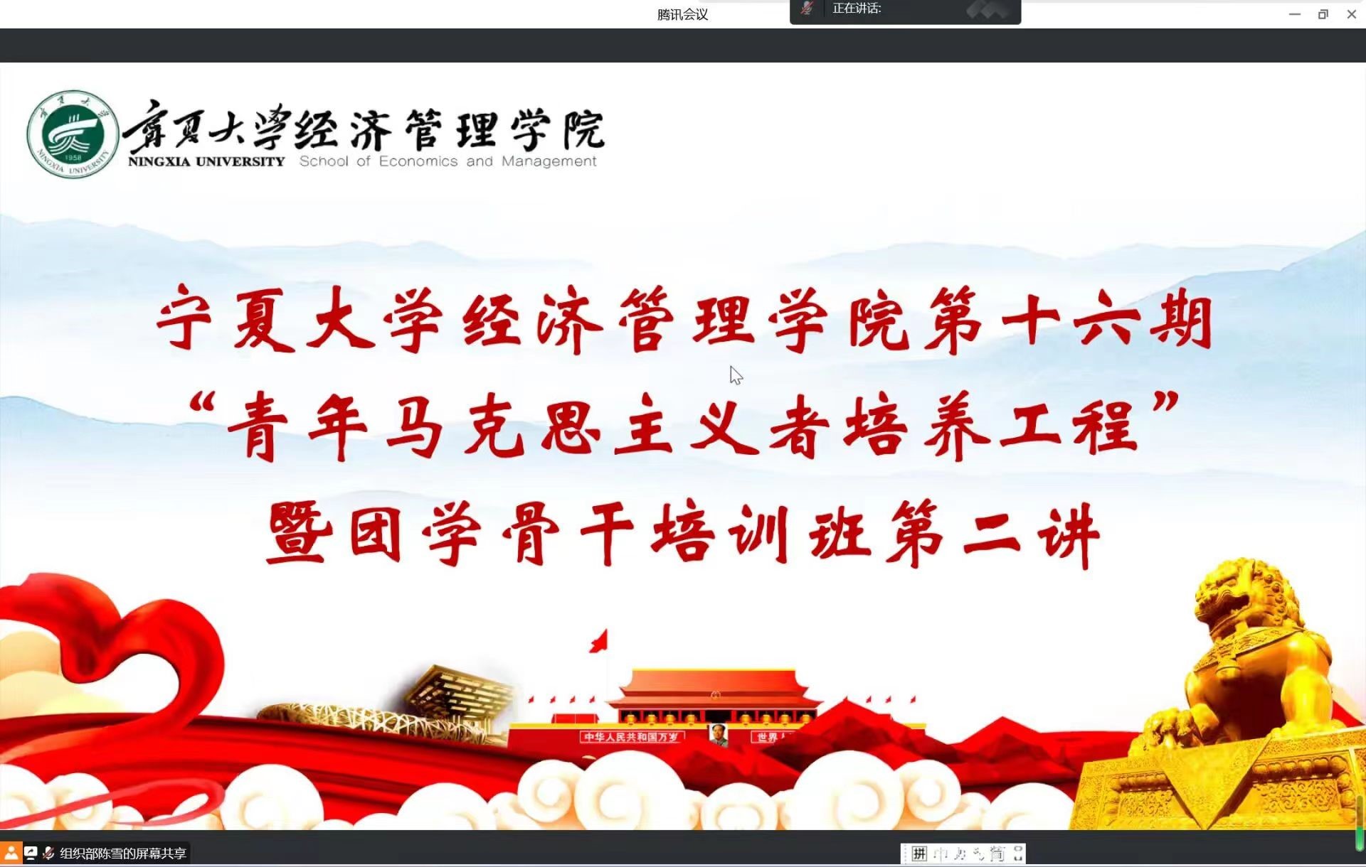 11月9日,亚新体育 第十六期“青年马克思主义者培养工程”暨团学骨干培训班第二讲于线上顺利举行。团委副书记孙文元、第十六期青马班成员参加本次培训。本次培训由孙文元主讲。