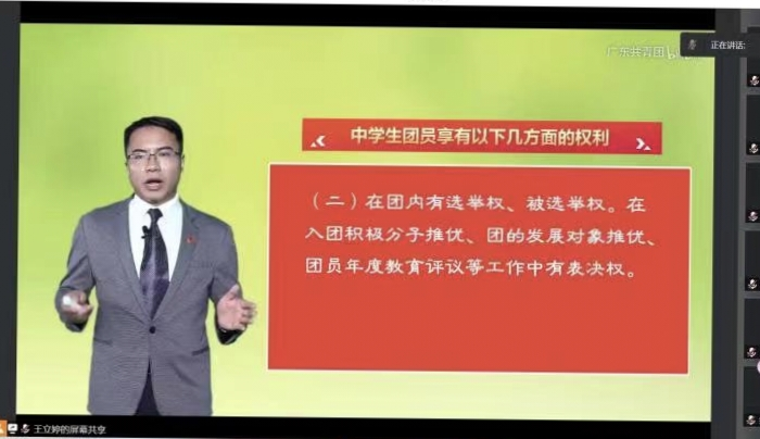 《新〈团章〉解读(广东中学共青团公开课)》向学员讲述了团章的发展历史,介绍了新团章的新亮点,并讲解了学习团章的重要意义以及团员应尽的义务和享有的权利。《有我》以悠扬的歌声和青年奉献社会的场景向学员展现了新时代青年坚定理想信念,奋勇争先的使命与担当。最后,各组代表分享了对此次活动的感悟,将理论与实践相结合,探讨了共青团的思想和精神,表达了对历史使命的深刻理解。